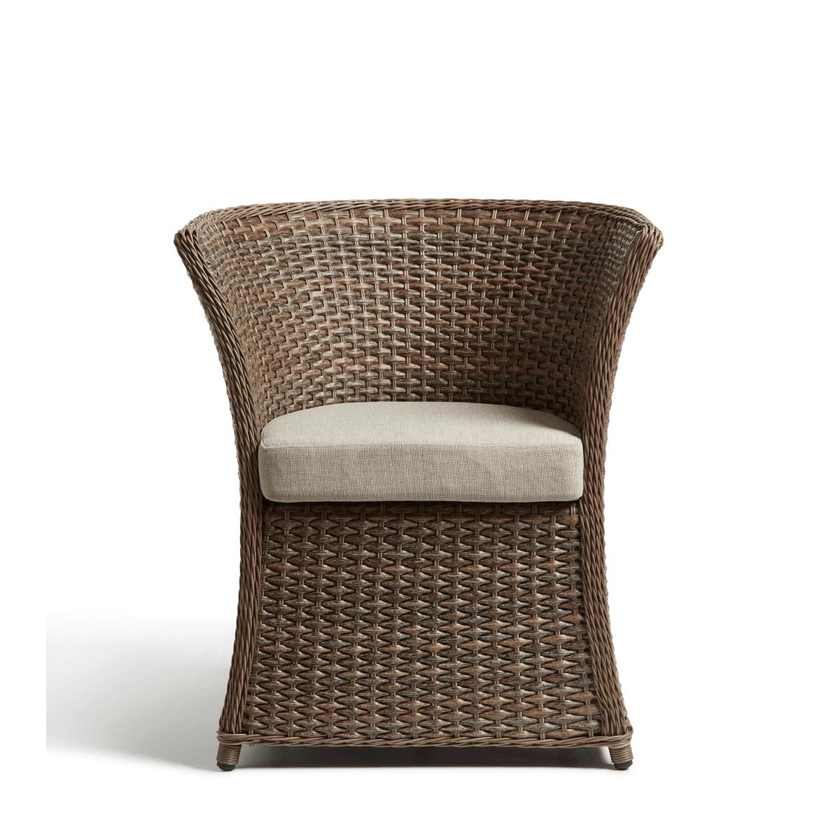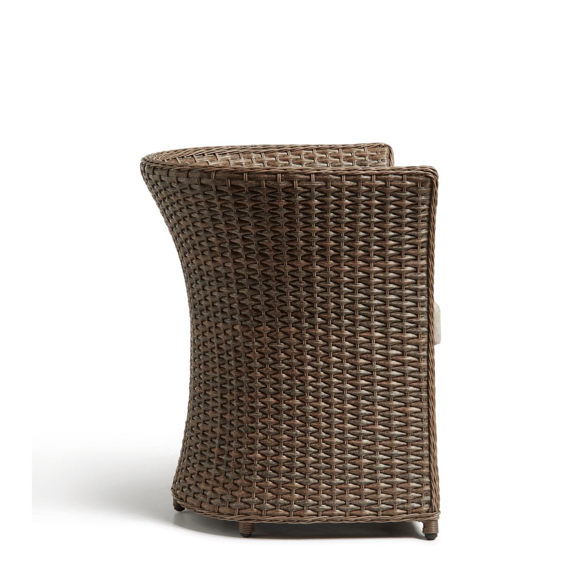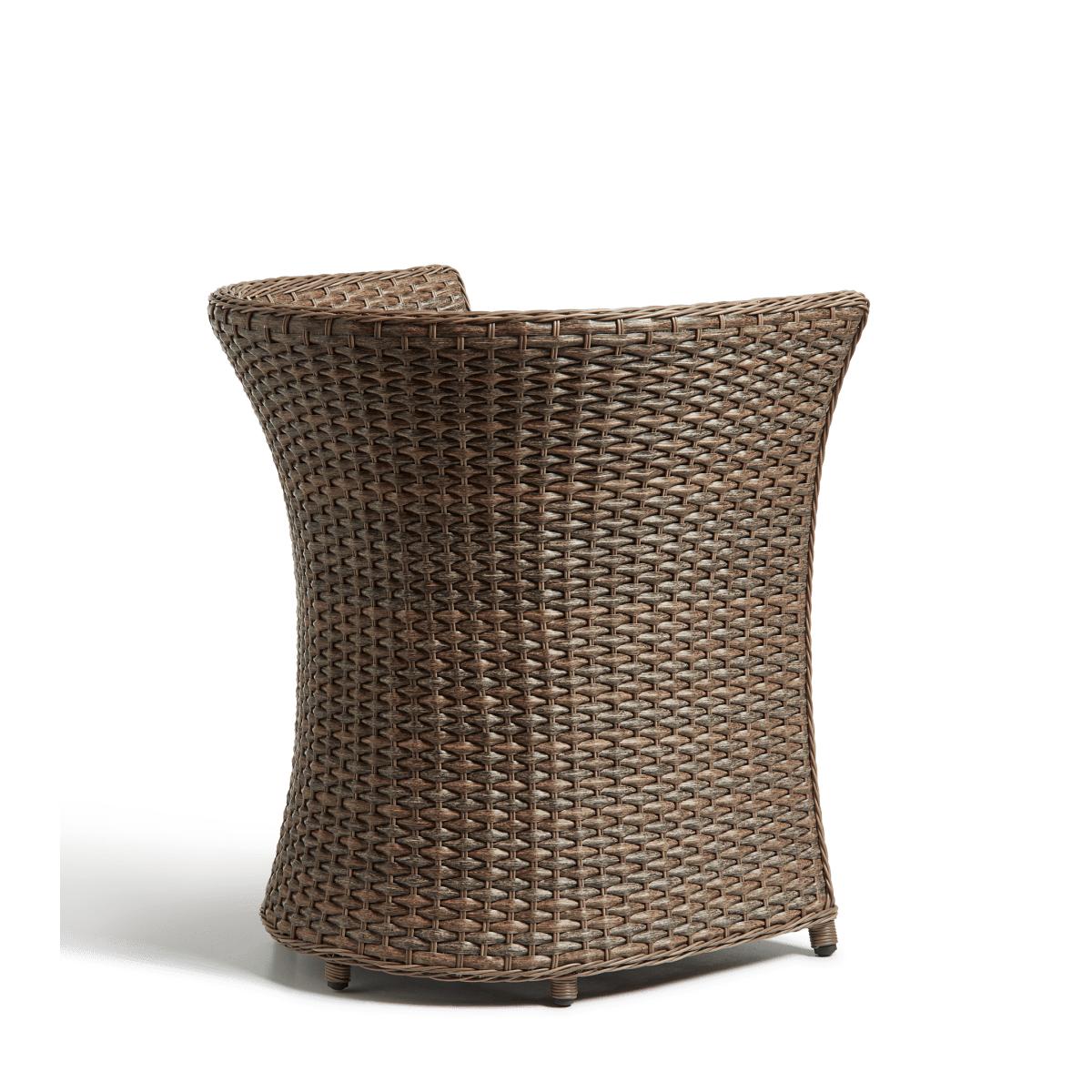 The Humphry Armchair has a sculptural appearance with its unusually flared, curving backrest that stretches from the top to the bottom. The continuous expanse of synthetic rattan is seamless, showcasing the craftsmanship of the weather-resistant piece.