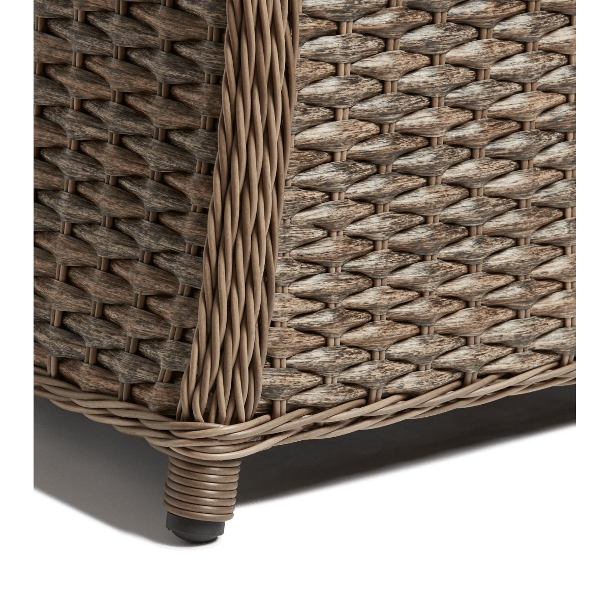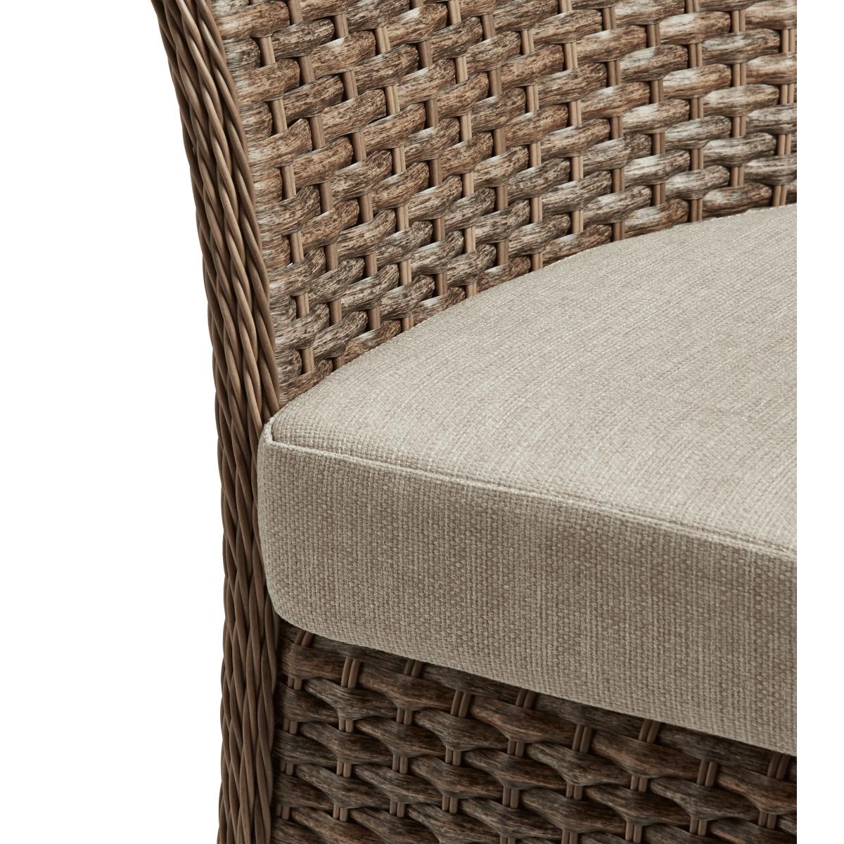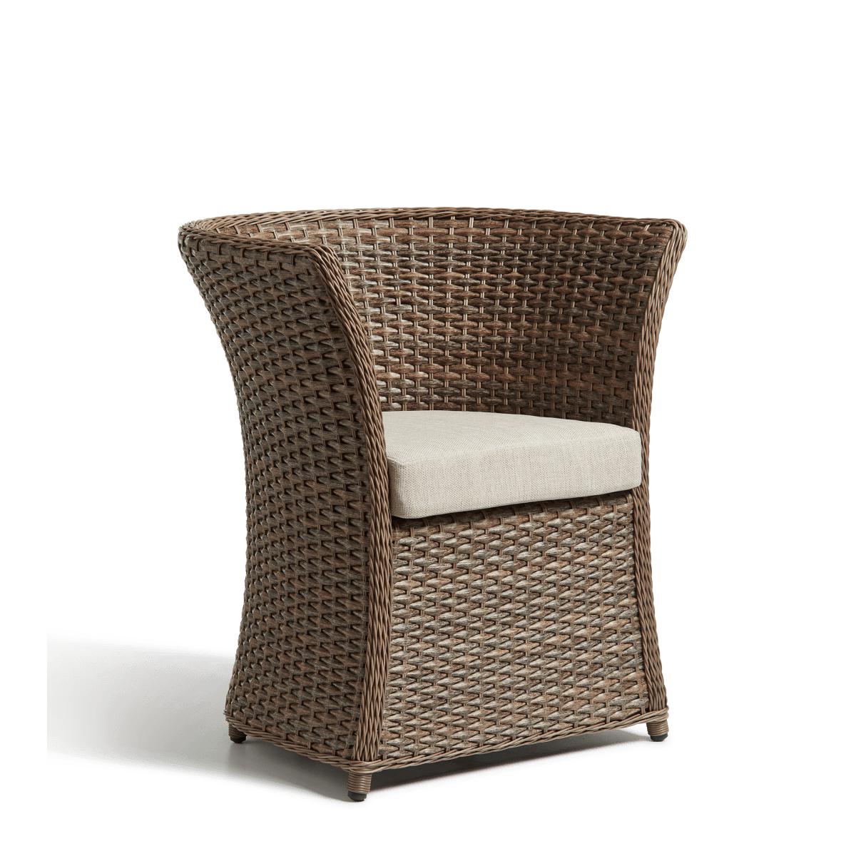 The Humphry Armchair has a sculptural appearance with its unusually flared, curving backrest that stretches from the top to the bottom. The continuous expanse of synthetic rattan is seamless, showcasing the craftsmanship of the weather-resistant piece.