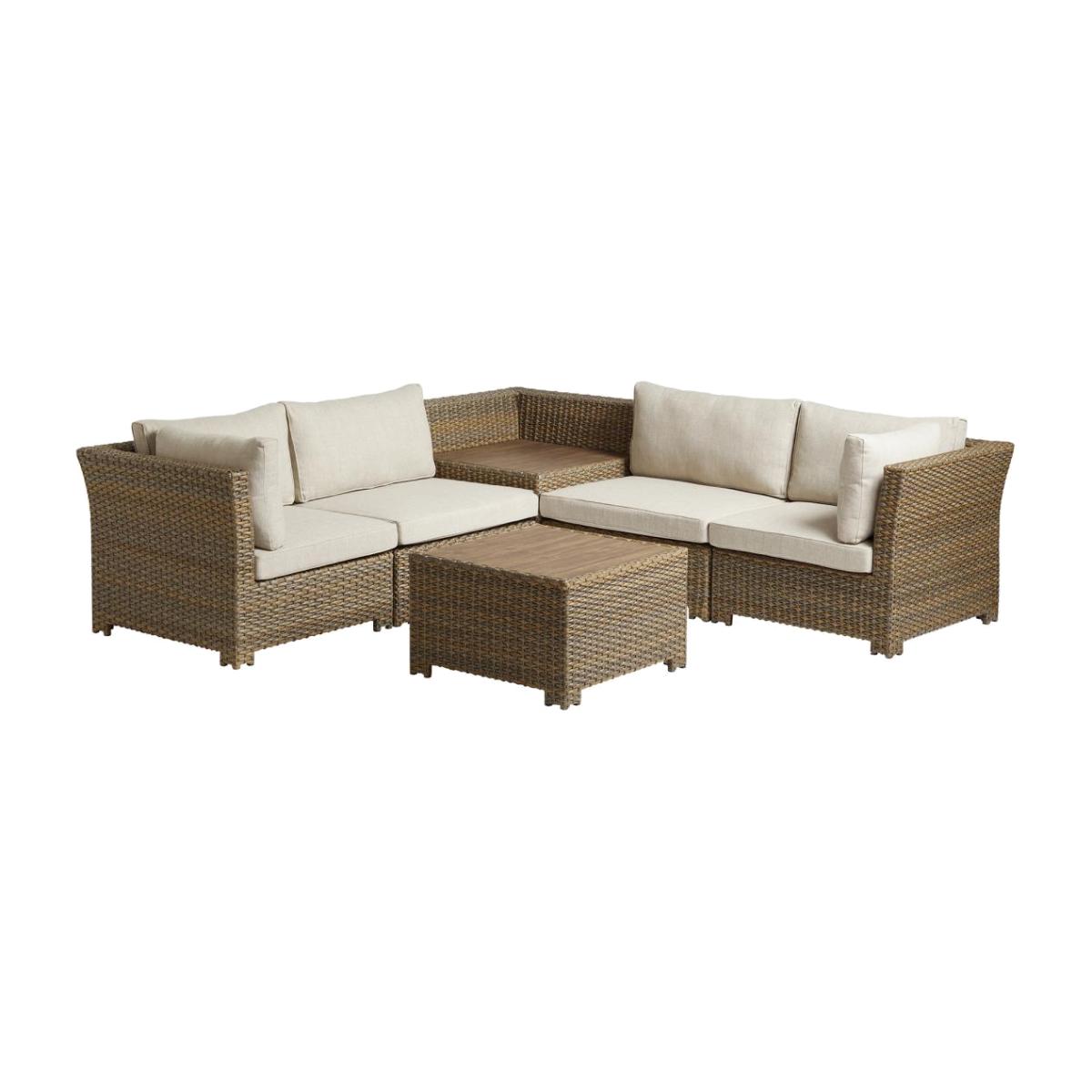The Humphry Corner Set includes a modular sofa in five parts, with a corner piece that acts as a table, as well as a second separate coffee table. Its neat weave is crafted from synthetic rattan, coloured to look like natural sea grass wicker, while benefitting from weather-resistant qualities. The tables feature wooden slatted surfaces, and the sofa comes with piped and padded seat and back cushions. Humphry Corner Set and Coffee Table - Bark