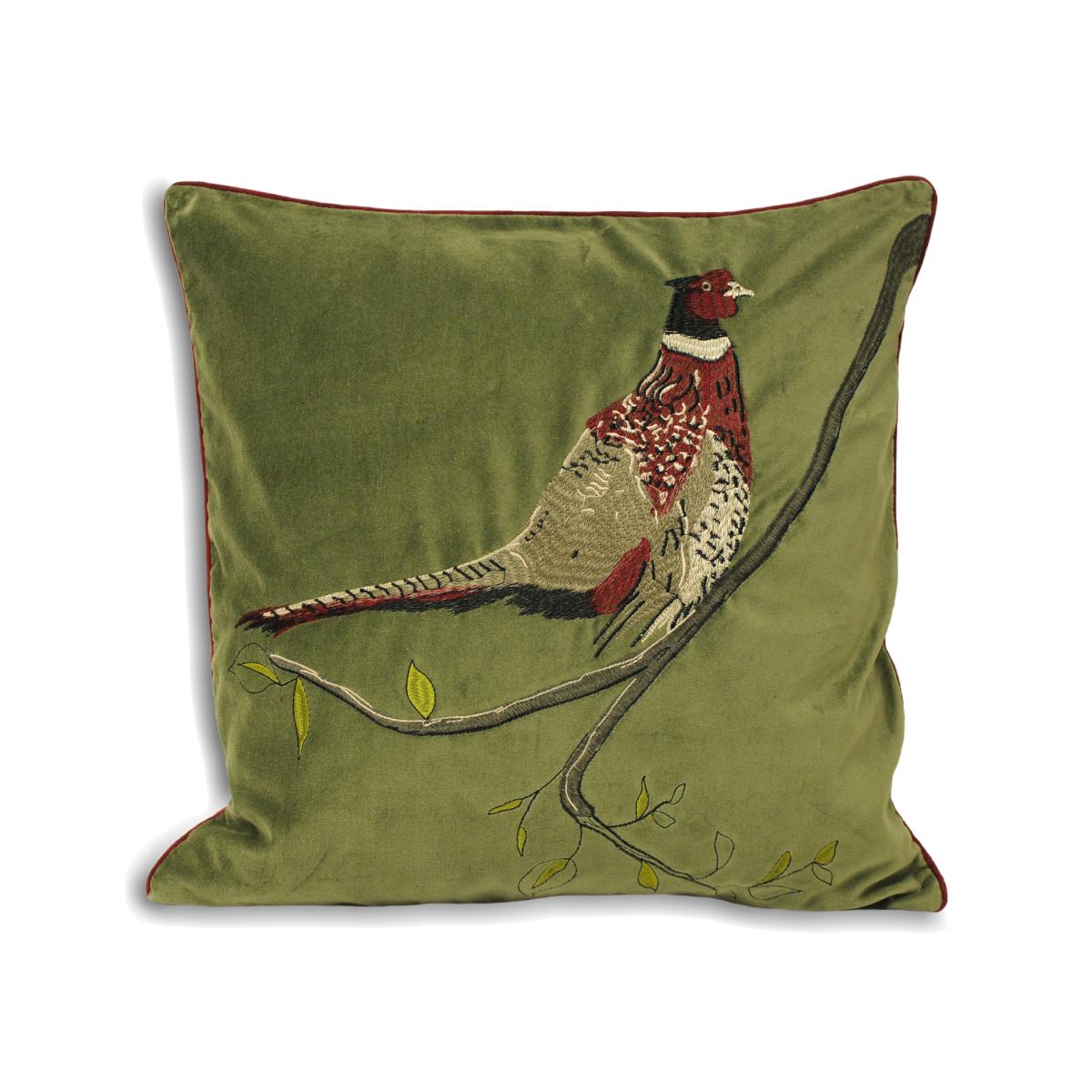 The Hunter Velvet cushion cover brings a modern twist to a country-inspired design. With faux velvet fabric which is wonderfully soft to touch it will shimmer when put in any kind of light while also providing velvets unique suppleness. The face is carefully embroidered with a detailed pheasant in rich burgundy, beige and black. Complete with a contrasting piped border and hidden zip closure. This sumptuous cushion is Made using 100 cotton making it a delight on beds and sofas while also providing you with the highest quality of colour. Available in three rich colourways with contrasting reverses it will pop in any setting. For the best results dry clean only and only iron on a cool setting.