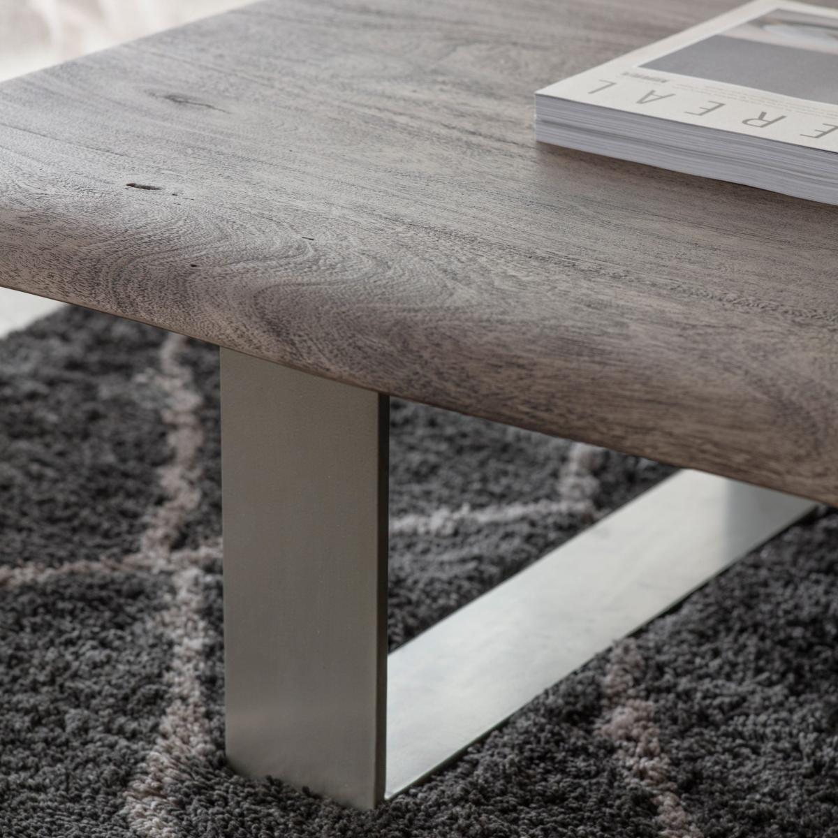 This beautiful coffee table makes a perfect addition to any setting, with its lovely acacia wood top with its waney edge, combined with a silver-colour powder coated iron legs.