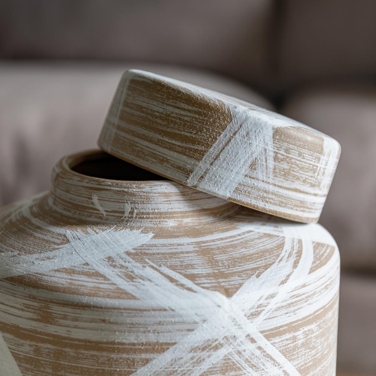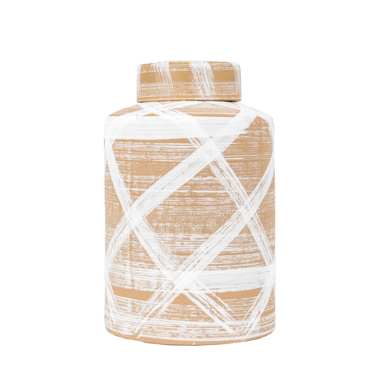 * Handmade* Hand painted* White and brown reactive glaze* Brushstroke look Perfect for storage anywhere in the home, this handmade cylindrical lidded jar features a stunning white and brown reactive glaze with a hand painted brushstroke look, making each piece truly unique. Matching vases also available