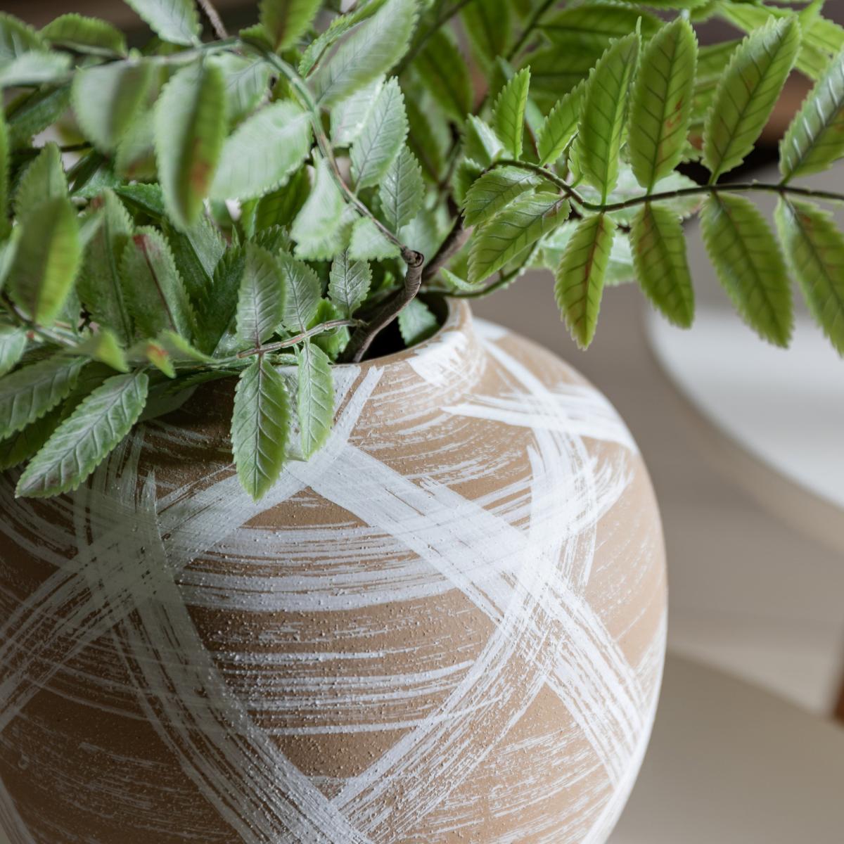 I really like this little vase; it’s a versatile piece that works well in both contemporary and more natural, earthy interiors. The reactive stoneware finish and striped detail add texture and visual interest without overwhelming a space. It’s perfect for showcasing fresh greenery or a few delicate flowers, making it an easy way to bring a touch of nature indoors. For styling, I suggest using it on a side table or windowsill paired with other neutral-toned accessories, or grouped with similar-sized vessels for a curated look. Its earthy brown tone can anchor warmer colour palettes, but it also works well as a subtle contrast in cooler, minimalist interiors.