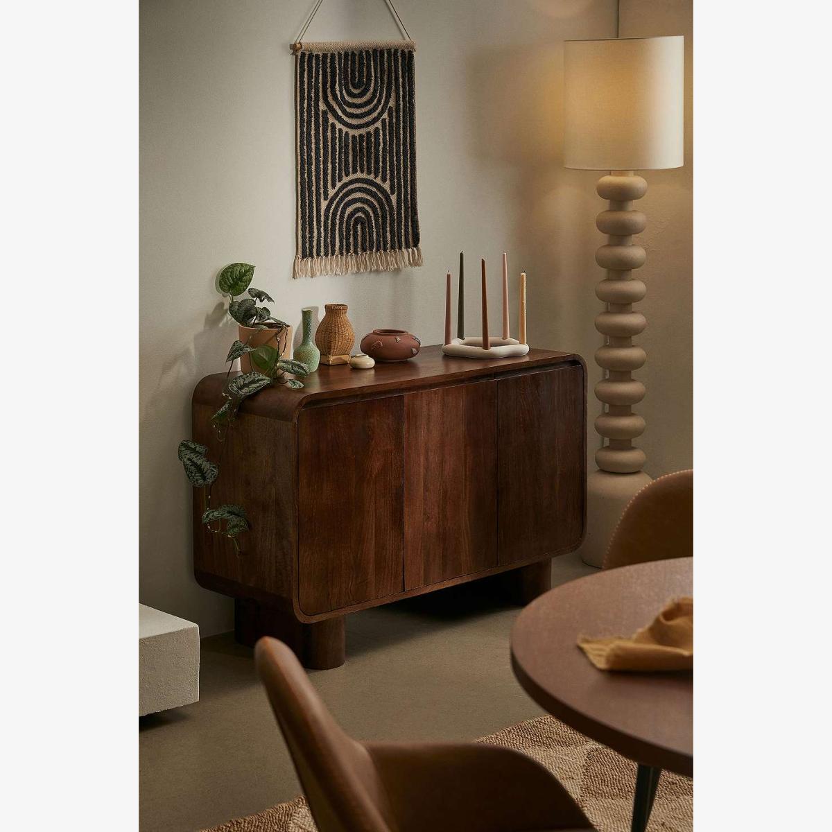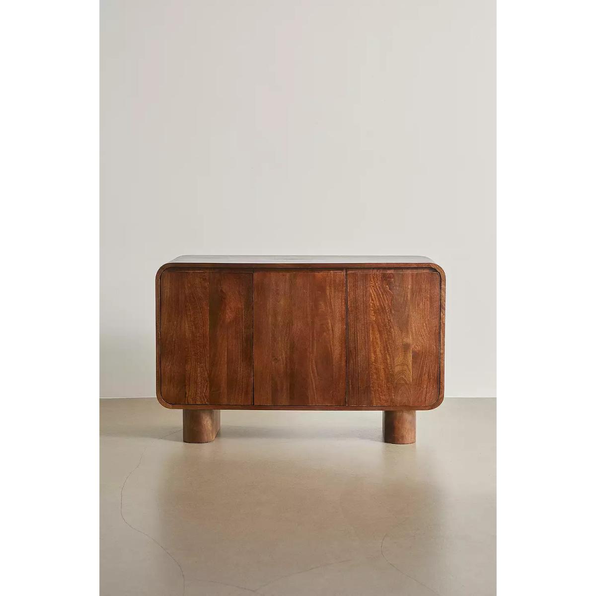 Modern-rustic mango wood dresser. Features six-drawer design and metal drawer glides with grooved pulls in a rich stain. Finished with curving corners and two cylindrical block feet. The sideboard you receive may differ slightly from images. Exclusive to Urban Outfitters. *Online return only. This item cannot be returned instore. Please note furniture items currently cannot be shipped to Northern Ireland or The Republic of Ireland. Delivery of large furniture items may take 1-2 weeks and are therefore not eligible for Next Day Delivery.* **Content + Care** \- Mango wood, MDF \- Wipe clean **Size** \- Dimensions: L: 139.7cm x W: 45.7cm x H: 82.6cm \- Top drawer dimensions: L: 61.2cm x W: 37.1cm x H: 14.2cm \- Middle drawer dimensions:L: 61.2cm x W:37.1cm x H: 16.3cm \- Bottom drawer dimensions: L: 61.2cm x W:37.1cm x H: 22.9cm \- Leg height: 15.2cm \- Weight: 111.4 lbs \- Shipping package weight: 125.7lbs