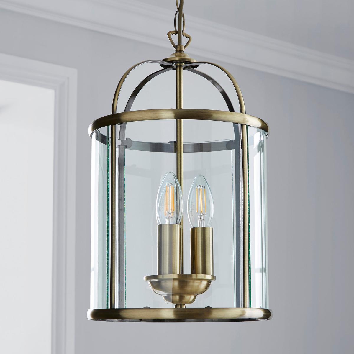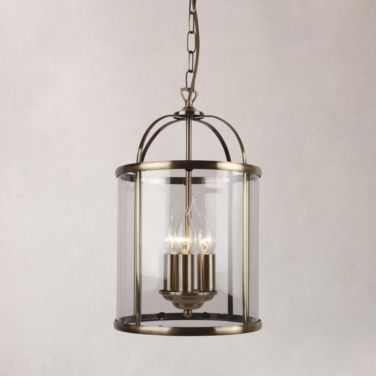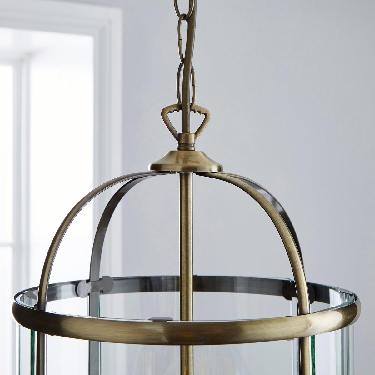 Finished with an elegant antique brass finish, this classic hanging lantern is crafted from clear glass and features three inside lights. Offering a sophisticated design, it will make a bold focal point in any room. 40 watt SES candle bulbs recommended.