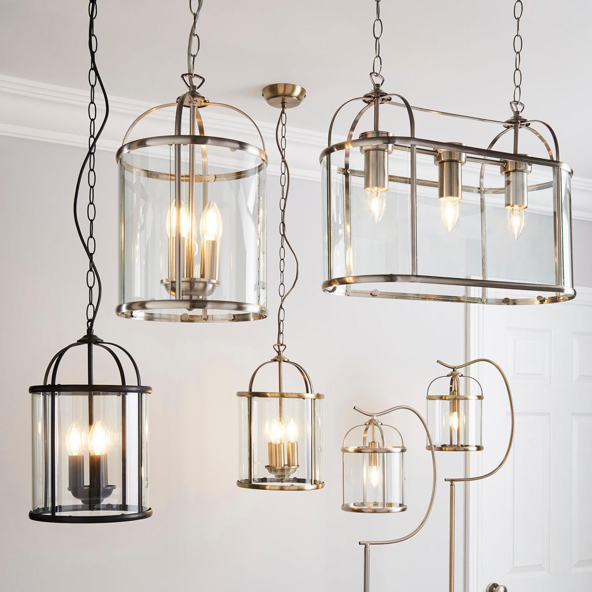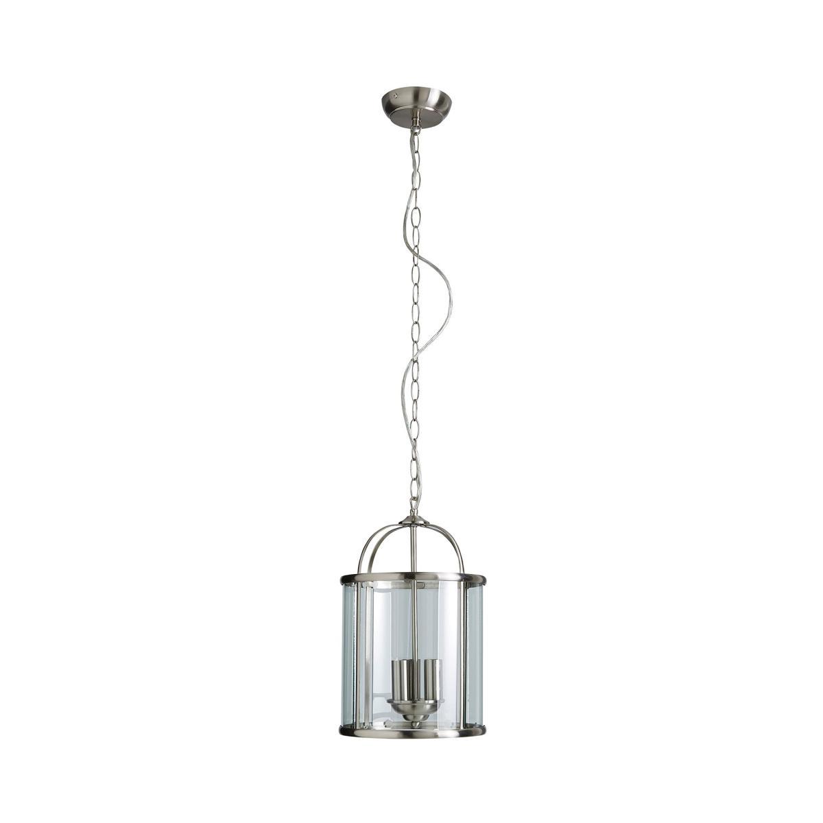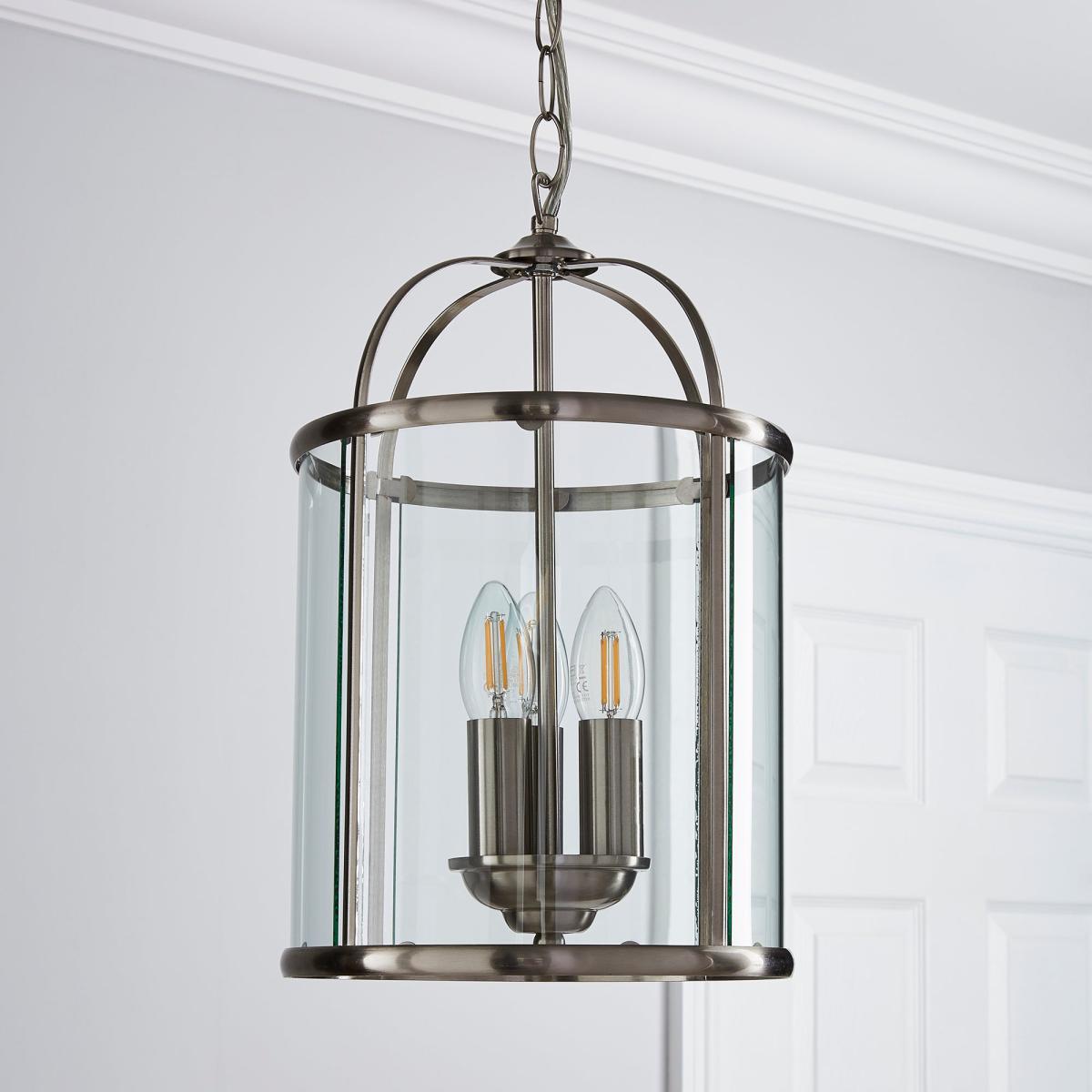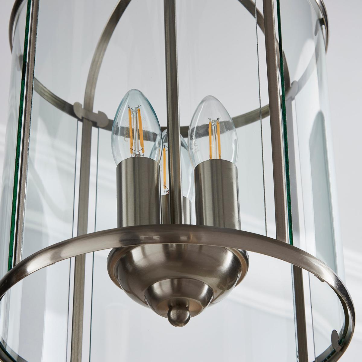 Crafted with a stylish satin nickel finish, the Hurricane 3 Light Pendant offers a classic hanging lantern design, complete with clear glass panels and a metal frame. Offering a timeless design, this light features a height adjustable chain suspension and would make a bold focal point in any room.
