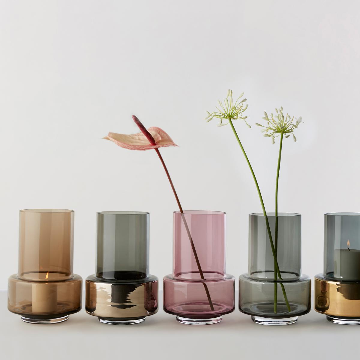 This Hurricane no. 26 from the Danish brand Ro Collection is evocative of an antique kerosene lamp — just like the classic light fixture, the Hurricane exudes a graceful glow and gentle atmosphere that is the perfect backdrop for any space. The beautiful lantern casts a luxurious shine whether you are inside or out of doors — a gleaming little keepsake out on the balcony for a crisp summer night, perhaps? Because the Hurricane tea light is made of mouth blown glass, small variations can occur in terms of air bubbles and the intensity of colour, rendering each individual piece entirely unique. The tea light's distinctive shape also makes it an excellent vase for stunning bouquets or a vessel for storing paint brushes. The Hurricane tea light is available in several sizes and colours.