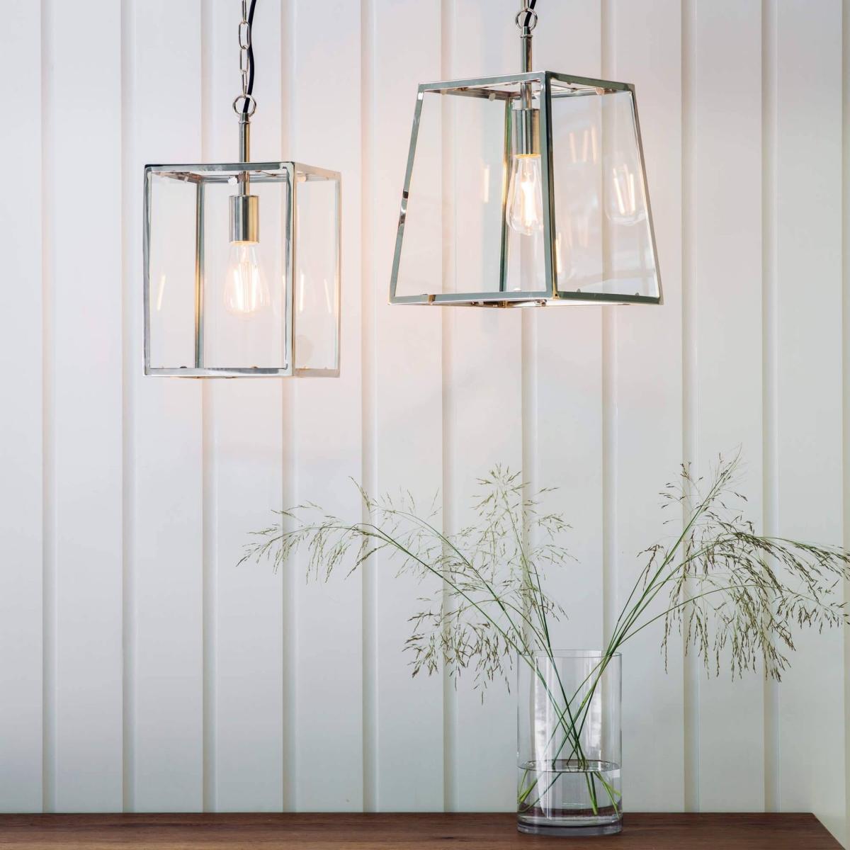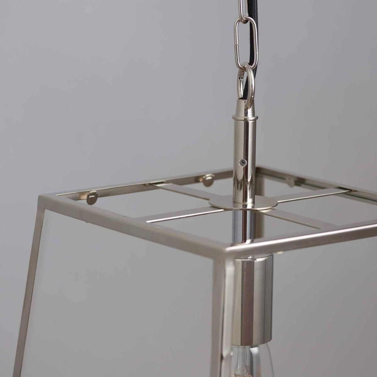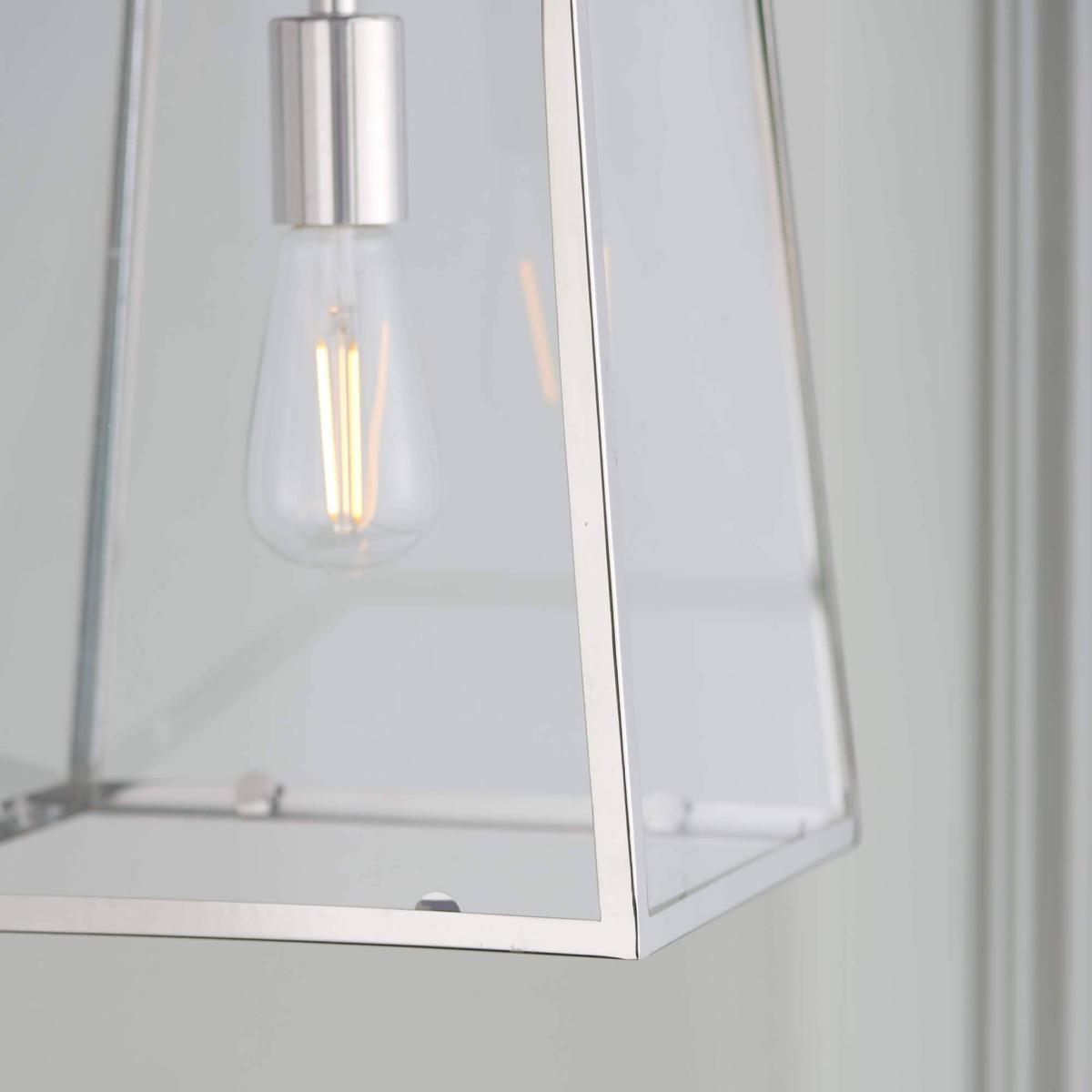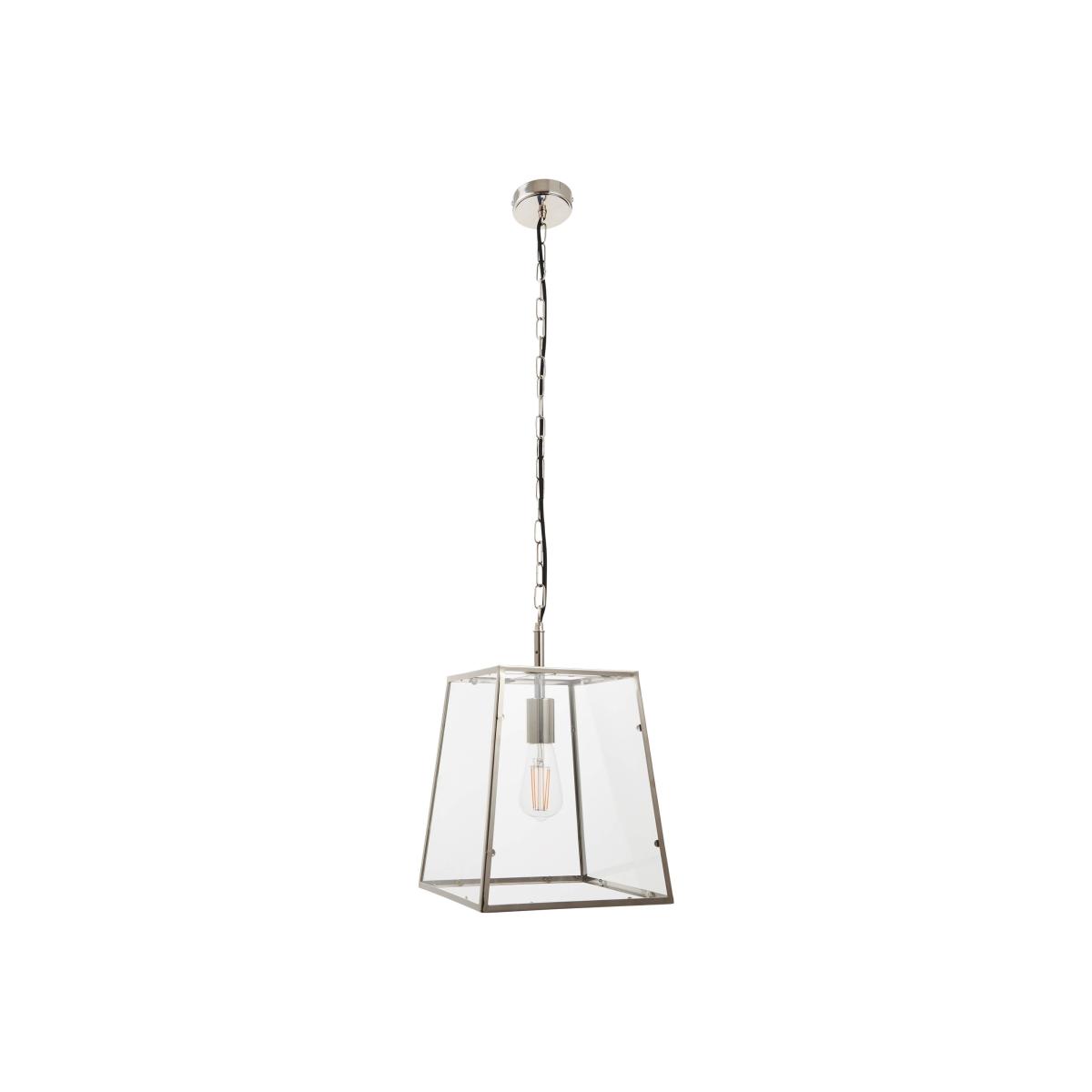 Contemporary box lantern pendant ceiling light in bright nickel. Authentic and timeless, inspired by box lanterns, the Hurst ceiling pendant is the perfect complimentary piece for neutral or classic interior styles. Finished in bright nickel and suspended from height adjustable chain with black fabric flex. Pair with vintage style LED filament bulbs that will be perfectly framed by the subtle metalwork and large clear glass panels. Contemporary box lantern pendant ceiling light in bright nickel. Authentic and timeless, inspired by box lanterns, the Hurst ceiling pendant is the perfect complimentary piece for neutral or classic interior styles. Finished in bright nickel and suspended from height adjustable chain with black fabric flex. Pair with vintage style LED filament bulbs that will be perfectly framed by the subtle metalwork and large clear glass panels.