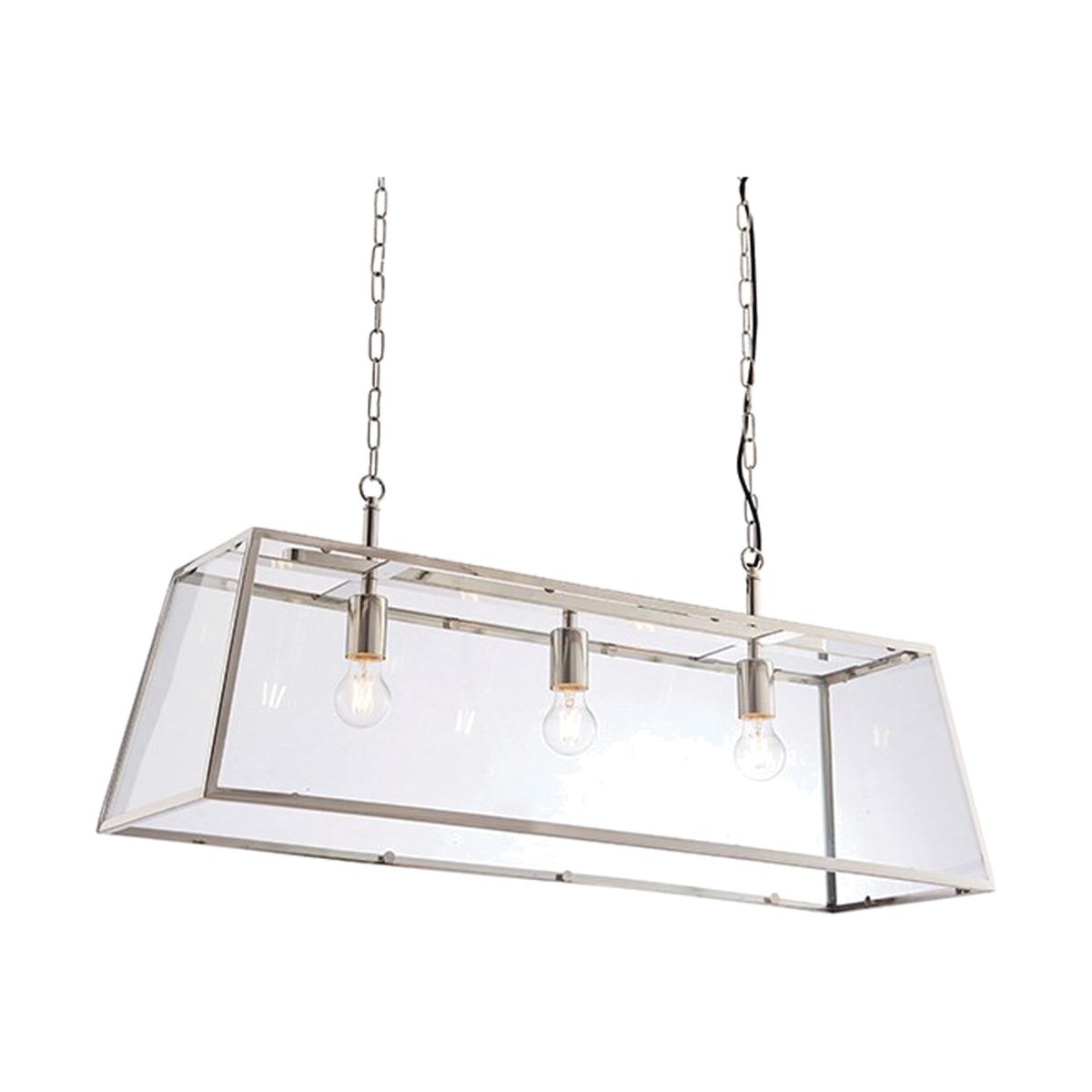 Inspired by box lanterns, the 3 light ceiling pendant is the perfect complement for today's relaxed classic interiors. Suspend over beautiful dining tables to achieve a timeless classic look. Finished in bright nickel and suspended from height adjustable chains with black fabric flex. Pair with vintage style filament LED lamps that are perfectly framed by the subtle tapered metalwork and large clear glass panels.