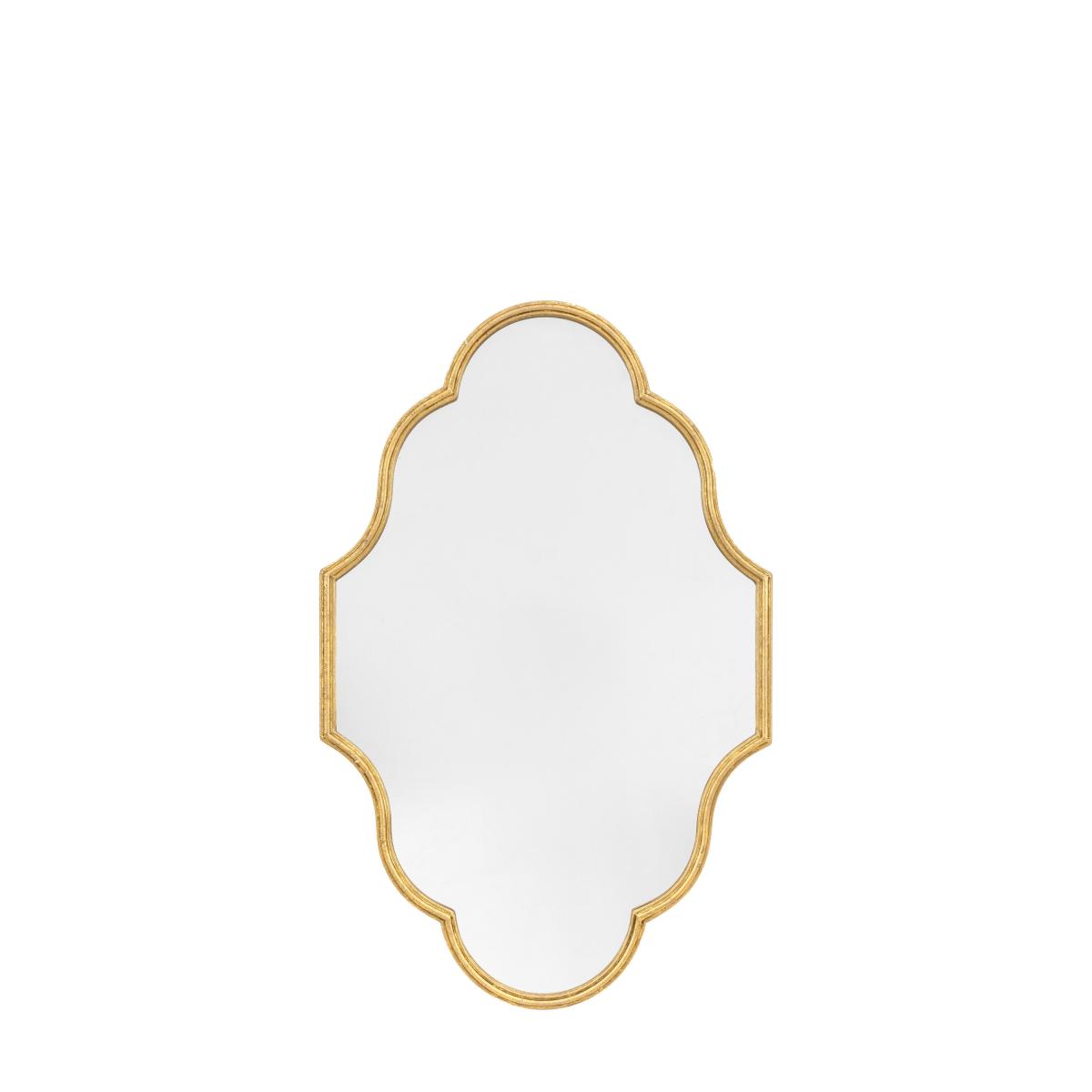 * Classic style* Irregular shape* Gold metal rim* Wall hanging This elegant mirror will bring classic, yet modern style to your home. With a gold-coloured metal rim and an interesting shape, this mirror is perfect for bringing light into a room whilst making a statement. Ideal for above mantlepieces, dressing tables or hallway consoles.