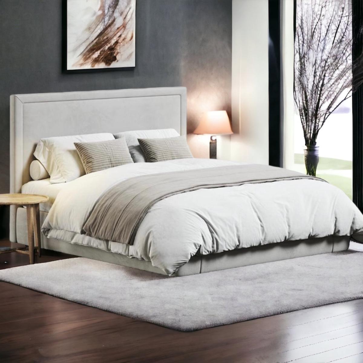 The Husky Bed frame features a Border bumper panel headboard with simple centre design on a thick high quality frame. Crafted for simplicity and a neutral tone to match any interior while still making it self the centre of the room thanks to its 54 inch high headboard and thick frame. Luxury Velvet. Handmade in the United Kingdom.
