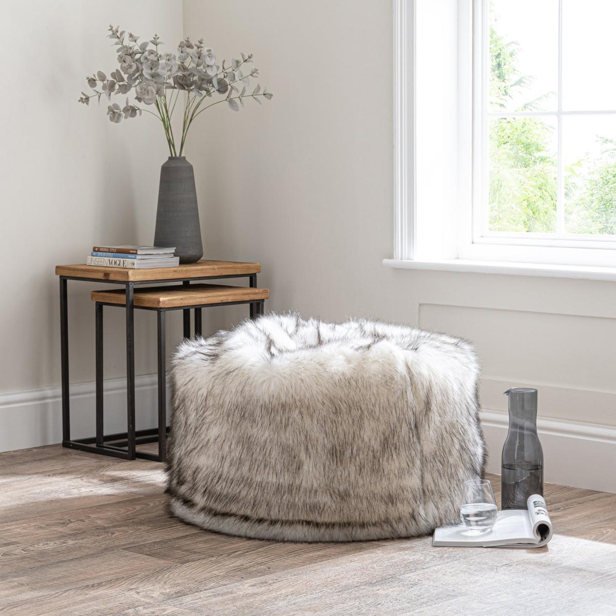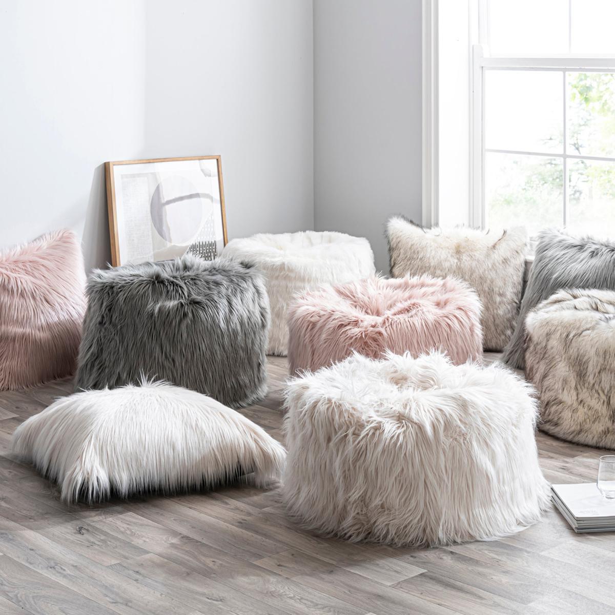 This indulgently soft faux fur bean lounger is inspired by the natural beauty of Husky fur. The black tips of the otherwise ivory coloured fur bring some wintery charm into your home. Finished with a non-slip base made from a durable non-woven, the lounger is generously filled with polybeads providing comfortable seating and support at the same time. Coordinating floor cushion available.
