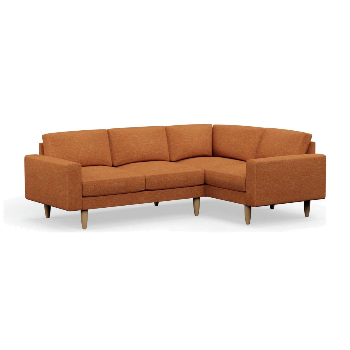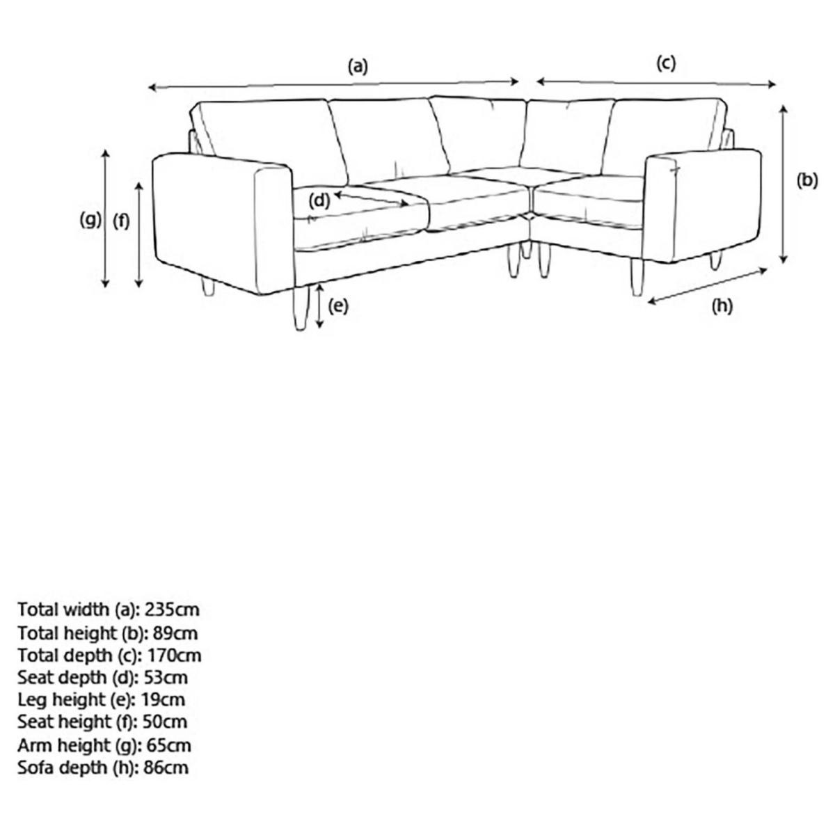 No need to choose form over function, our stylish Rise 4 seat corner sofa-in-a-box gives you ultimate versatility and maximum comfort. Inspired by mid-century modern design, we've added square profile block arms to our classic contemporary frame and finished with tapered wooden legs for the ultimate timeless look. Thoughtfully designed with a mix of old and new techniques, our traditional hand woven platform bases are paired with modern foam filled seat, and we've even included recycled polyester in our back cushions. All Hutch sofas are handmade in the UK and come with a 20 year frame guarantee. No tools required - all of our sofas are easy to assemble and can be put together in no time. Simply screw the legs in, slot the backs and arms in, add your cushions and you're ready to go. Even better - you can conifgure the sofa to be left or right hand facing! Reversible corner. Material: Made from 91% polyester and 9% polyamide. Light wood feet. Medium firm seat cushions. Fixed seats with foam filling. Removable cushion(s) with fibre filling. Dimensions: Size H89, longer width 235, shorter width 170,. Floor to seat height: 50cm. Depth of seat: 53cm. Height of seat back: 41cm. Shorter seating area width between arms: 121cm. Longer seating area width between arms: 186cm. Height of arm rest: 65cm. Weight: 99kg. Packaged dimensions: Package size H89, W50, D38cm. Second package size H93, W135.5, D61.5cm. General information: Wipe clean or lightly vacuum. Minimal assembly. Maximum individual user weight: 130kg. Manufacturer's 20 year frame guarantee.
