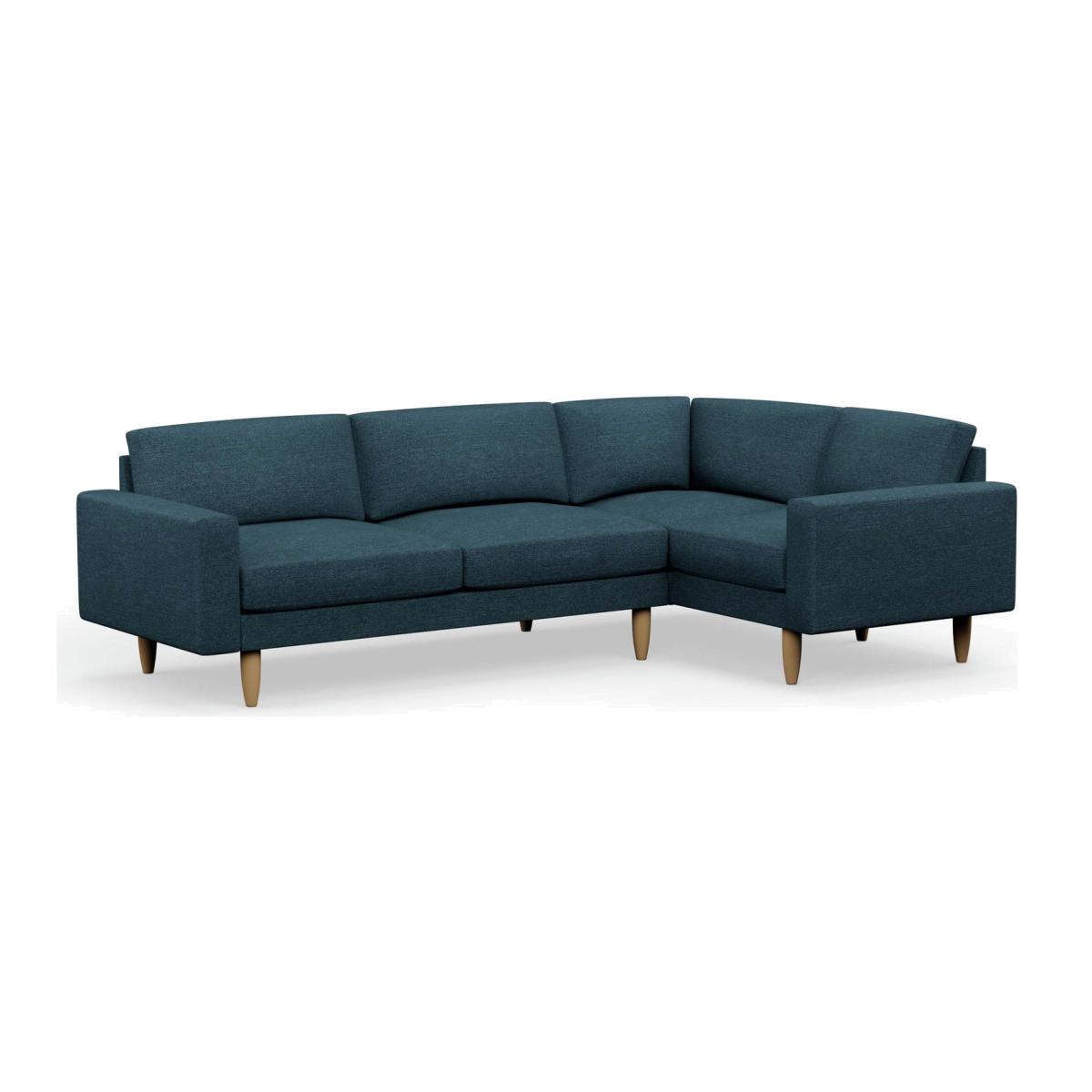 No need to choose form over function, our stylish Rise 5 Seat Slim Corner Sofa-in-a-box gives you ultimate versatility and maximum comfort. Inspired by mid-century modern design, we've added square profile block arms to our classic contemporary frame and finished with tapered wooden legs for the ultimate timeless look. Thoughtfully designed with a mix of old and new techniques, our traditional hand woven platform bases are paired with modern foam filled seat, and we've even included recycled polyester in our back cushions. All Hutch sofas are handmade in the UK and come with a 20 year frame guarantee. No tools required - all of our sofas are easy to assemble and can be put together in no time. Simply screw the legs in, slot the backs and arms in, add your cushions and you're ready to go. Even better - you can conifgure the sofa to be left or right hand facing! Reversible corner. Material: Made from 91% polyester and 9% polyamide. Light wood feet. Medium firm seat cushions. Fixed seats with foam filling. Removable cushion(s) with fibre filling. Dimensions: Size H89, longer width 280, shorter width 170,. Floor to seat height: 50cm. Depth of seat: 53cm. Height of seat back: 41cm. Shorter seating area width between arms: 121cm. Longer seating area width between arms: 231cm. Height of arm rest: 65cm. Weight: 108kg. Packaged dimensions: Package size H89, W50, D38cm. Second package size H93, W178, D61.5cm. General information: Wipe clean or lightly vacuum. Minimal assembly. Maximum individual user weight: 130kg. Manufacturer's 20 year frame guarantee.