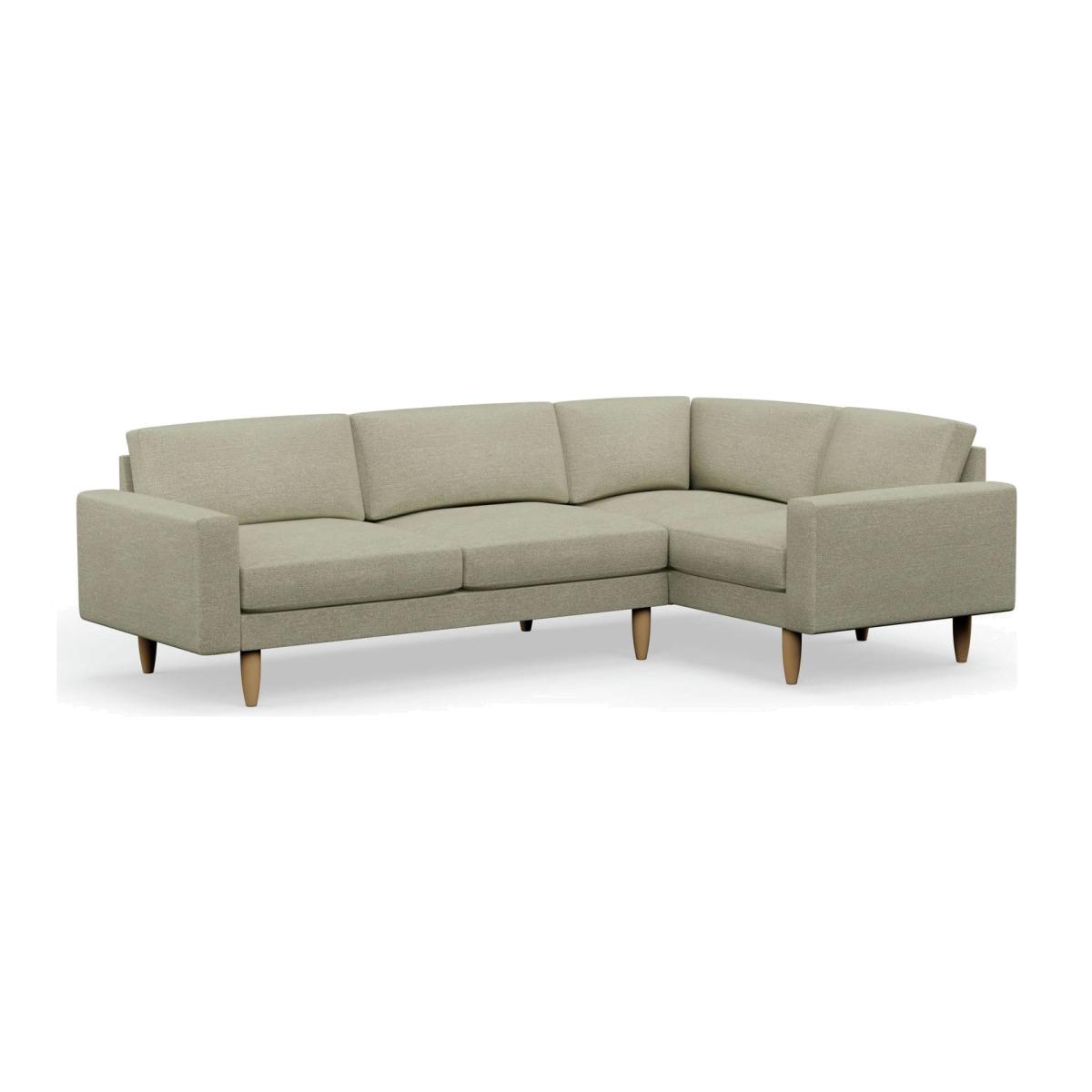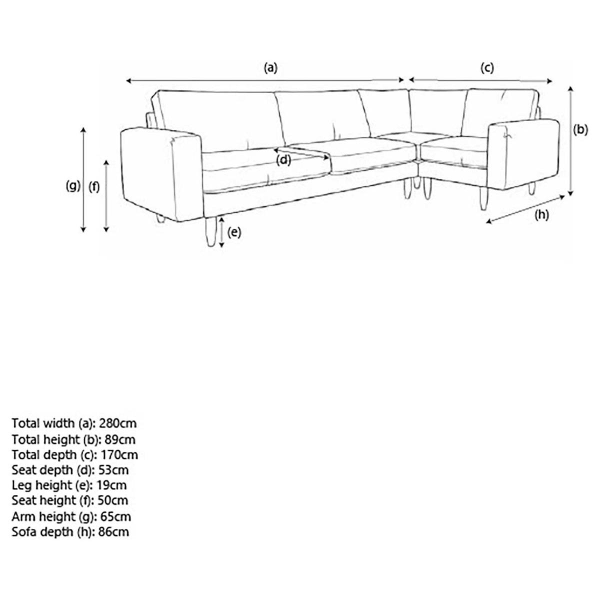 No need to choose form over function, our stylish Rise 5 Seat Slim Corner Sofa-in-a-box gives you ultimate versatility and maximum comfort. Inspired by mid-century modern design, we've added square profile block arms to our classic contemporary frame and finished with tapered wooden legs for the ultimate timeless look. Thoughtfully designed with a mix of old and new techniques, our traditional hand woven platform bases are paired with modern foam filled seat, and we've even included recycled polyester in our back cushions. All Hutch sofas are handmade in the UK and come with a 20 year frame guarantee. No tools required - all of our sofas are easy to assemble and can be put together in no time. Simply screw the legs in, slot the backs and arms in, add your cushions and you're ready to go. Even better - you can conifgure the sofa to be left or right hand facing! Reversible corner. Material: Made from 91% polyester and 9% polyamide. Light wood feet. Medium firm seat cushions. Fixed seats with foam filling. Removable cushion(s) with fibre filling. Dimensions: Size H89, longer width 280, shorter width 170,. Floor to seat height: 50cm. Depth of seat: 53cm. Height of seat back: 41cm. Shorter seating area width between arms: 121cm. Longer seating area width between arms: 231cm. Height of arm rest: 65cm. Weight: 108kg. Packaged dimensions: Package size H89, W50, D38cm. Second package size H93, W178, D61.5cm. General information: Wipe clean or lightly vacuum. Minimal assembly. Maximum individual user weight: 130kg. Manufacturer's 20 year frame guarantee.