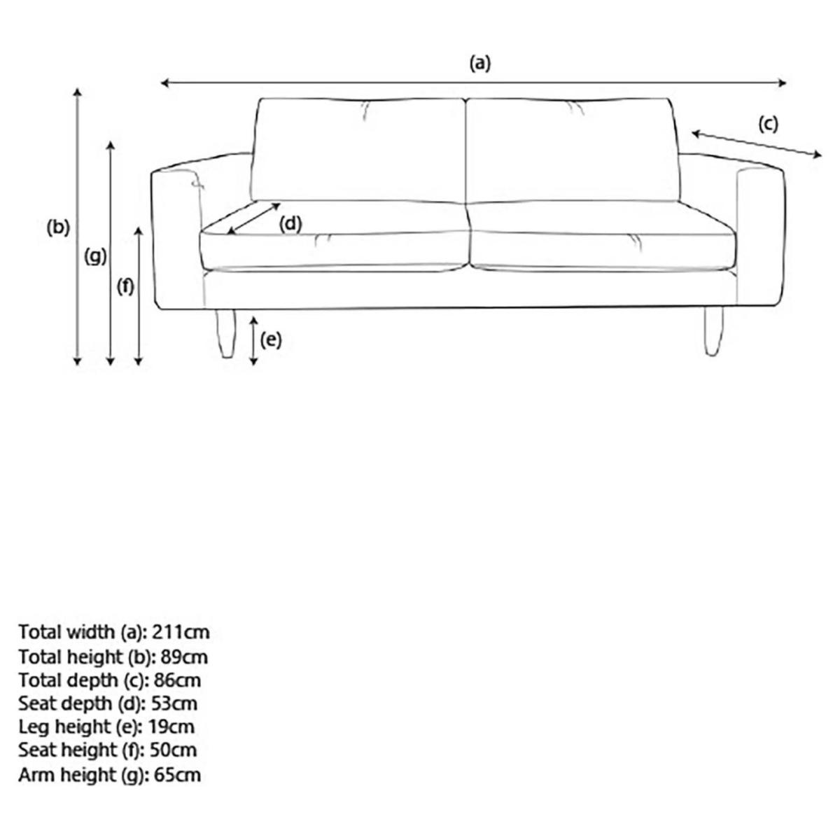 No need to choose form over function, our stylish Rise 3 Seater Sofa-in-a-box gives you ultimate versatility and maximum comfort. Inspired by mid-century modern design, we've added square profile block arms to our classic contemporary frame and finished with tapered wooden legs for the ultimate timeless look. Thoughtfully designed with a mix of old and new techniques, our traditional hand woven platform bases are paired with modern foam filled seat cushions for a medium to firm sit, and we've even included recycled polyester in our back cushion. All Hutch sofas are handmade in the UK and come with a 20 year frame guarantee. No tools required - all of our sofas are easy to assemble and can be put together in no time. Simply screw the legs in, slot the backs and arms in, add your cushions and you're ready to go. Material: Made from 100% polyester. Light wood feet - grey. Medium firm seat cushions. Fixed seats with foam filling. Removable cushion(s) with fibre filling. Dimensions: Size H89, W211, D86cm. Floor to seat height: 50cm. Depth of seat: 53cm. Height of seat back: 41cm. Width of seating area between arms: 175cm. Height of arm rest: 65cm. Weight: 60.2kg. Packaged dimensions: Package size H92, W178.5, D58cm. Second package size H89, W50, D38cm. General information: Wipe clean or lightly vacuum. Minimal assembly. Maximum individual user weight: 130kg. Manufacturer's 20 year frame guarantee.