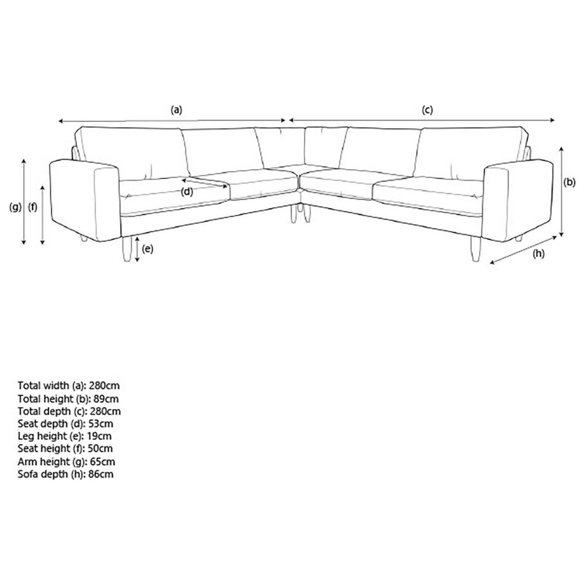 No need to choose form over function, our stylish Rise 7 Seat Corner Sofa-in-a-box gives you ultimate versatility and maximum comfort. Inspired by mid-century modern design, we've added square profile block arms to our classic contemporary frame and finished with tapered wooden legs for the ultimate timeless look. Thoughtfully designed with a mix of old and new techniques, our traditional hand woven platform bases are paired with modern foam filled seat cushions, and we've even included recycled polyester in our back cushions. All Hutch sofas are handmade in the UK and come with a 20 year frame guarantee. No tools required - all of our sofas are easy to assemble and can be put together in no time. Simply screw the legs in, slot the backs and arms in, add your cushions and you're ready to go. Even better - you can conifgure the sofa to be left or right hand facing! Reversible corner. Material: Made from 100% polyester. Light wood feet. Medium firm seat cushions. Fixed seats with foam filling. Removable cushion(s) with fibre filling. Dimensions: Size H89, longer width 280, shorter width 280,. Floor to seat height: 50cm. Depth of seat: 53cm. Height of seat back: 41cm. Shorter seating area width between arms: 231cm. Longer seating area width between arms: 231cm. Height of arm rest: 65cm. Weight: 132kg. Packaged dimensions: Package size H89, W50, D38cm. Second package size H93, W178.5, D61.5cm. General information: Wipe clean or lightly vacuum. Minimal assembly. Maximum individual user weight: 130kg. Manufacturer's 20 year frame guarantee.
