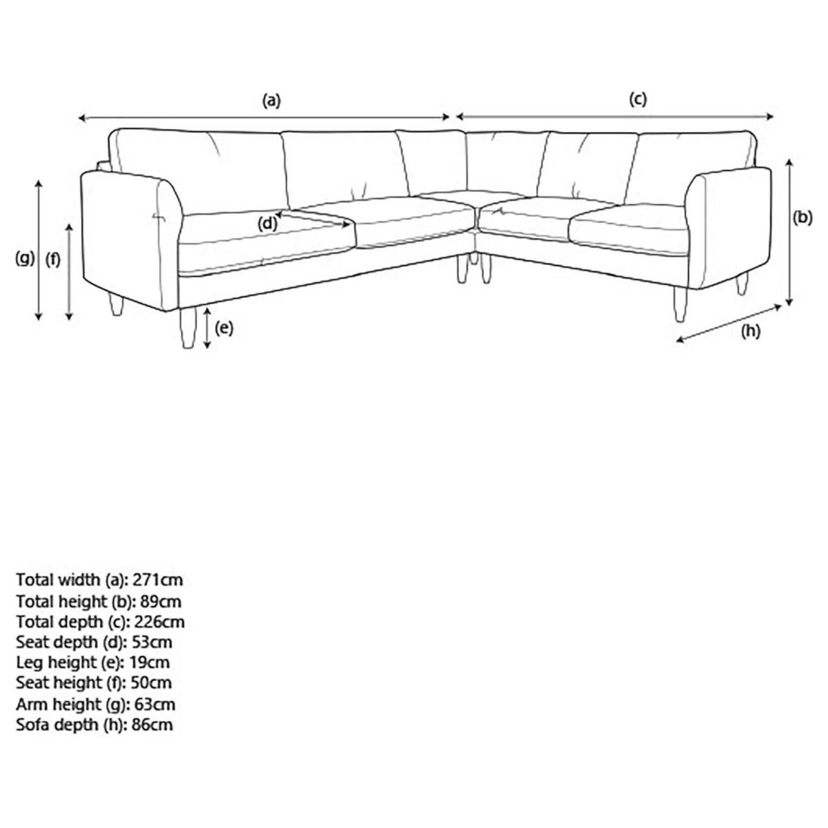 No need to choose form over function, our stylish Rise 6 seat corner sofa-in-a-box gives you ultimate versatility and maximum comfort. Perfect for rooms where a sleek silhouette is needed, we've paired our classic contemporary style with an elegant curved arm for a more refined profile. Thoughtfully designed with a mix of old and new techniques, our traditional hand woven platform bases are paired with modern foam filled seat cushions for a medium to firm sit, and we've even included recycled polyester in our back cushions. All Hutch sofas are handmade in the UK and come with a 20 year frame guarantee. No tools required - all of our sofas are easy to assemble and can be put together in no time. Simply screw the legs in, slot the backs and arms in, add your cushions and you're ready to go. Even better - you can conifgure the sofa to be left or right hand facing! Reversible corner. Material: Made from 100% polyester. Light wood feet. Medium firm seat cushions. Fixed seats with foam filling. Removable cushion(s) with fibre filling. Dimensions: Size H89, longer width 271, shorter width 226,. Floor to seat height: 50cm. Depth of seat: 53cm. Height of seat back: 41cm. Shorter seating area width between arms: 186cm. Longer seating area width between arms: 231cm. Height of arm rest: 63cm. Weight: 121kg. Packaged dimensions: Package size H89, W55, D23cm. Second package size H93, W178.5, D61.5cm. General information: Wipe clean or lightly vacuum. Minimal assembly. Maximum individual user weight: 130kg. Manufacturer's 20 year frame guarantee.