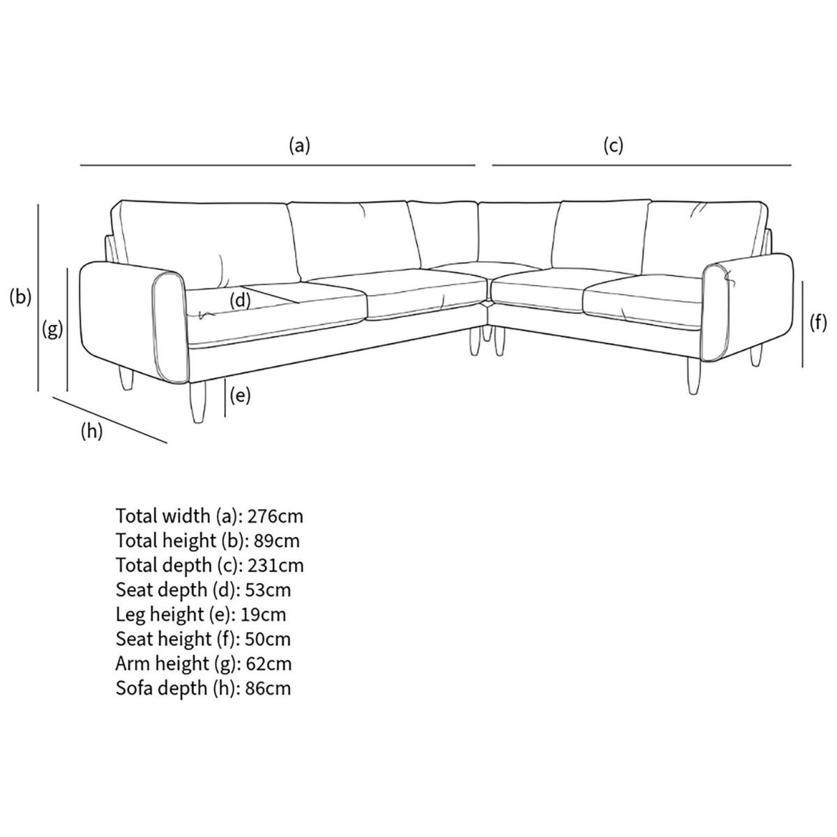 No need to choose form over function, our stylish Rise 6 Seat Corner Sofa-in-a-box gives you ultimate versatility and maximum comfort. We've kept our Round sofa arms contemporary with a clean profile and minimalist design, but added just the right amount of curve to add softness into any room. Thoughtfully designed with a mix of old and new techniques, our traditional hand woven platform bases are paired with modern foam filled seat cushions for a medium to firm sit, and we've even included recycled polyester in our back cushion. All Hutch sofas are handmade in the UK and come with a 20 year frame guarantee. No tools required - all of our sofas are easy to assemble and can be put together in no time. Simply screw the legs in, slot the backs and arms in, add your cushions and you're ready to go. Even better - you can conifgure the sofa to be left or right hand facing! Reversible corner. Material: Made from 100% polyester. Light wood feet. Medium firm seat cushions. Fixed seats with foam filling. Removable cushion(s) with fibre filling. Dimensions: Size H89, longer width 276, shorter width 231,. Floor to seat height: 50cm. Depth of seat: 53cm. Height of seat back: 41cm. Shorter seating area width between arms: 186cm. Longer seating area width between arms: 231cm. Height of arm rest: 62cm. Weight: 122kg. Packaged dimensions: Package size H89, W47, D30cm. Second package size H93, W178.5, D61.5cm. General information: Wipe clean or lightly vacuum. Minimal assembly. Maximum individual user weight: 130kg. Manufacturer's 20 year frame guarantee.