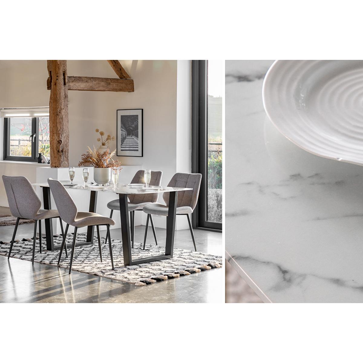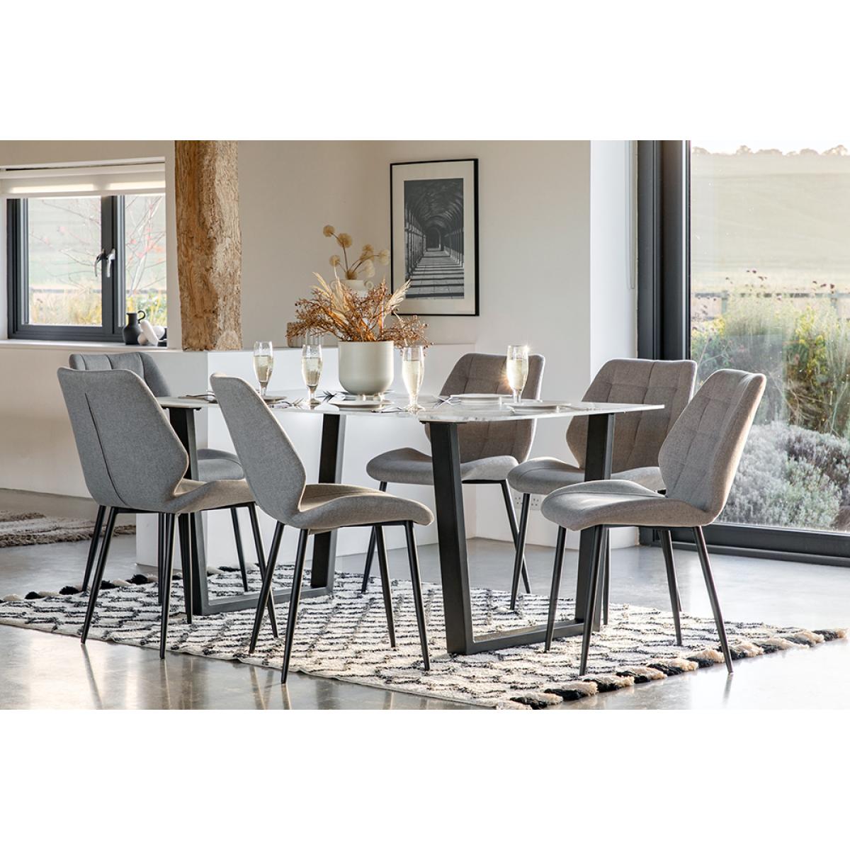 I’m a big fan of this Huxley table for its clean lines and the luxe feel of the black marble top. It slots easily into contemporary or industrial schemes, especially when paired with metal-frame chairs or warm timber seating to soften the look. For styling, keep surfaces uncluttered: a simple ceramic vase or low, sculptural bowl lets the marble pattern stand out. Underneath, a natural-fibre rug adds texture and prevents the dark legs from disappearing against hard floors. It also works well beside a statement pendant light to balance its linear frame.