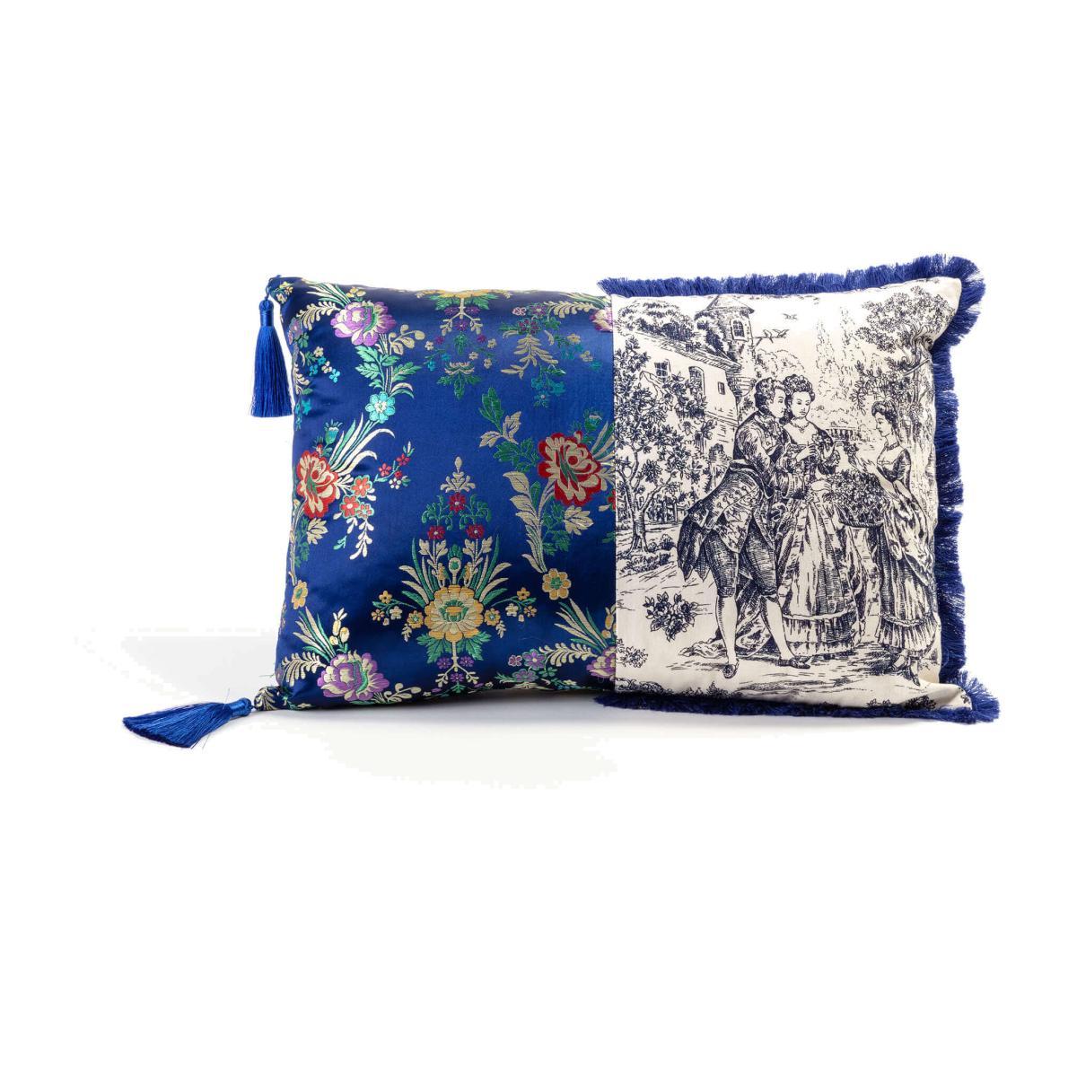 These cushions are part of the Hybrid collection designed by the incredible Ctrlzak studio. Every piece in the collection has a double personality. The vintage patterns are boldly combined with traditional decorative elements, inspired by an East-meets-West fusion. The cushions are composed of two sections, each with a unique pattern and decoration, resembling two separate piece fused together. The side adorned with Asian-inspired patterns boasts two pompoms. The other side has an ancient print inspired by Western culture and fringing. This visible separation creates a visible border between the East and West, and paradoxically consolidates their union. A bridge between the past and the present, an embodiment of "East meets West", Hybrid offers an exuberant combination of traditions and modernity! The subtle and original work of the ornamentation creates an astonishing, delicate harmony.