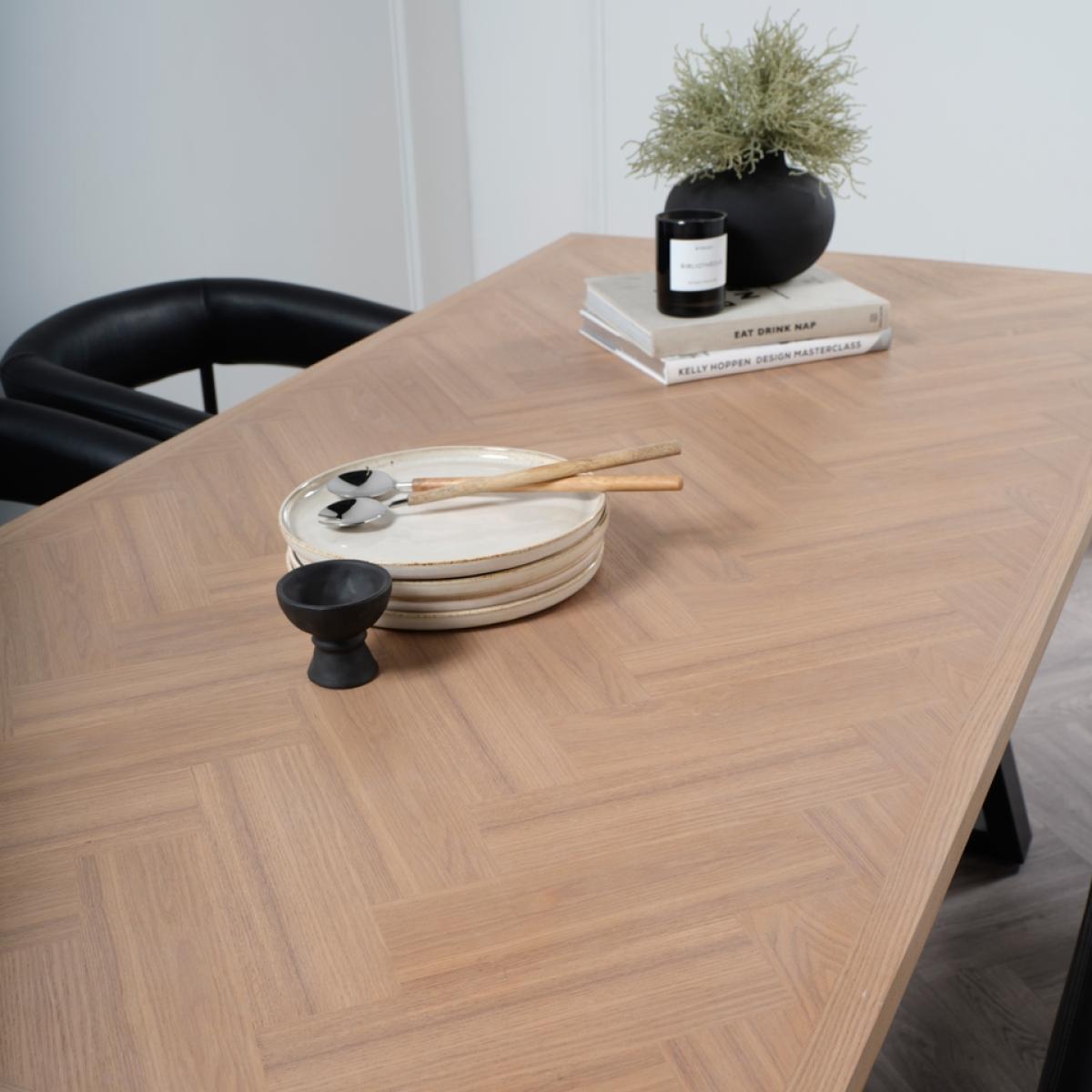 The Hyde wooden dining table, in natural and black, features a stylish herringbone top and a sleek black metal leg frame. With its modern design, it can comfortably seat up to 8 people, making it a perfect centrepiece for any contemporary dining space.