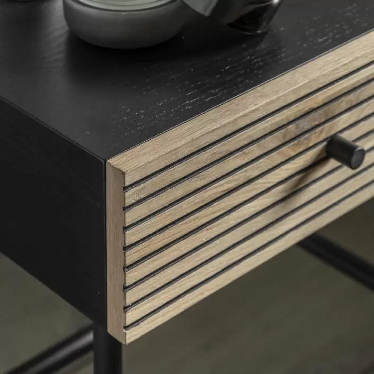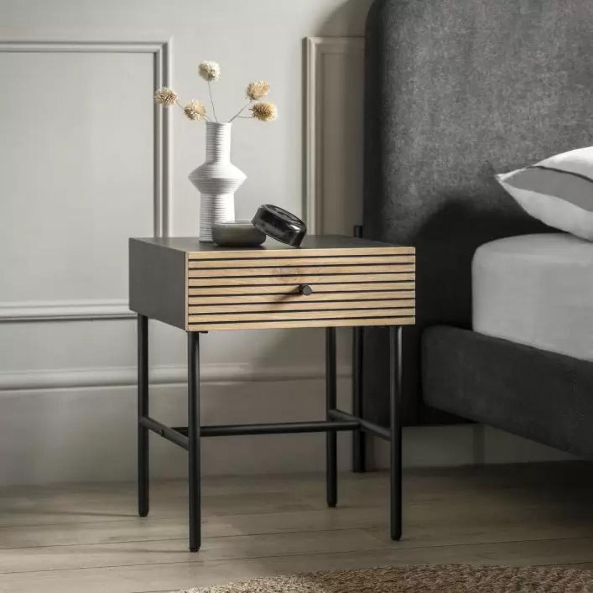 Add a contemporary look to a room with this stylish bedside. The carcase has a black finish with a pressed woodgrain effect to create a premium look. The drawer fascia is real oak woodgrain veneer with a feature black line pattern. A black metal underframe and drawer handle complete the look. Matching items available.