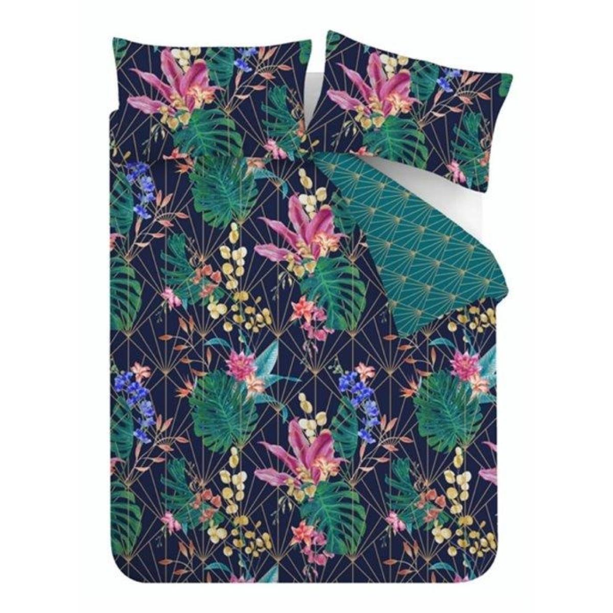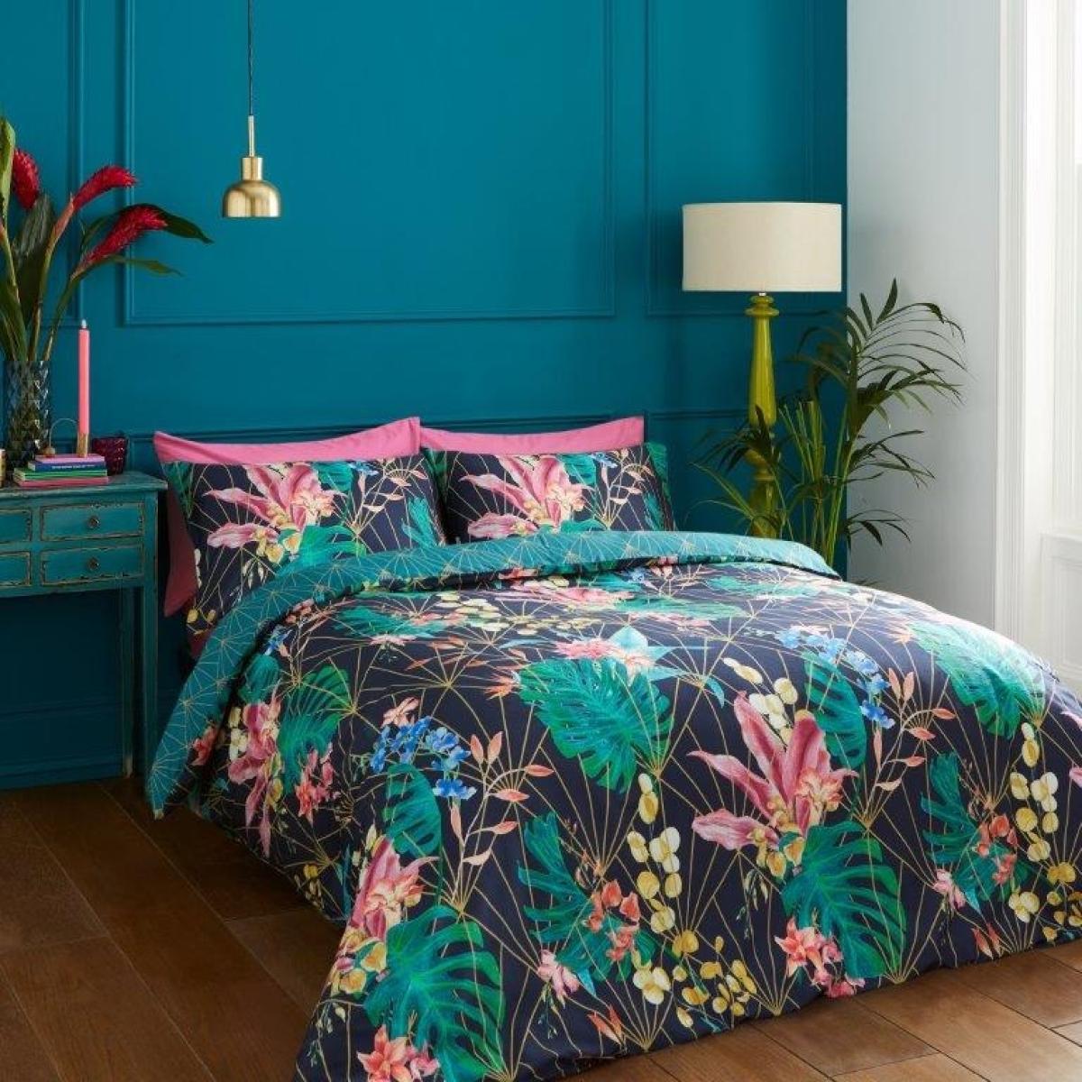 This sumptuously crafted 200 Thread Count soft touch Cotton sateen bedlinen captures statement tropical botanicals with highlights of gold geometric pattern. Accompanied by a teal art deco fan reverse for elevated styling options. 200 Thread Count Cotton, Soft to Touch Sateen, Button Fastening 100% Cotton. Double Duvet Set- 200x200cm + 2x 50x75cm Pillowcases. Wash Before Use. Machine Wash at 40 Degrees, Tumble Dry Safe. Ethically sourced overseas and made to quality and human-ecological safety standards, in accordance with STANDARD 100 by OEKO-TEX. Better Cotton- By choosing our cotton product, you're supporting Hyperion Interiors's investment in Better Cotton's mission. Better Cotton is sourced via a chain of custody model called mass balance, this means that this product may not contain Better Cotton, however Better Cotton Farmers benefit from the demand for Better Cotton in equivalent volumes to those used. The HYPERION INTERIORS collection of bed linens, curtains and cushions has been lovingly curated, bringing together the best designs, innovative techniques and beautiful fabrics that are made to the highest standards ensuring lasting quality and a touch of luxury for years to come. All screens vary in colour reproduction and whilst every effort has been made to display the colour as accurately as possible it is for guidance only.