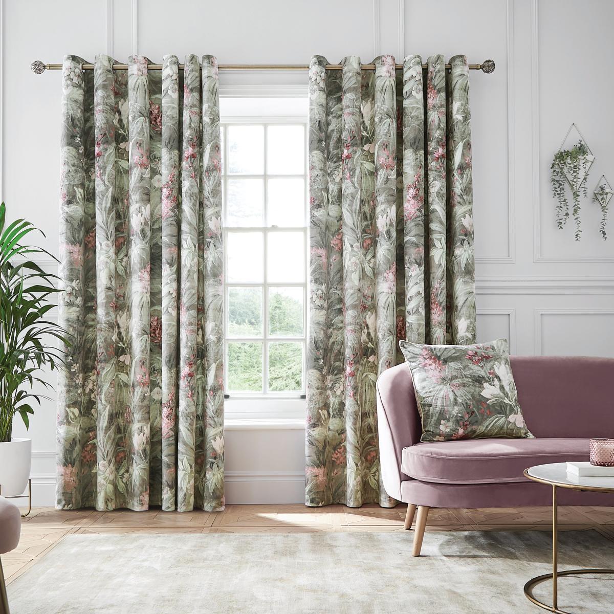 Crafted from a sumptuous heavyweight soft touch velour with a beautiful digitally printed floral design. Complemented with weighted corners and a soft touch dyed to match lining. Created with an eyelet header giving elegant folds for a beautiful drape. These curtains will provide privacy and added insulation. Their eyelet header can easily slide onto your pole for quick fitting. Please note:. Pattern matching can not be guaranteed across multiple pairs of curtains.