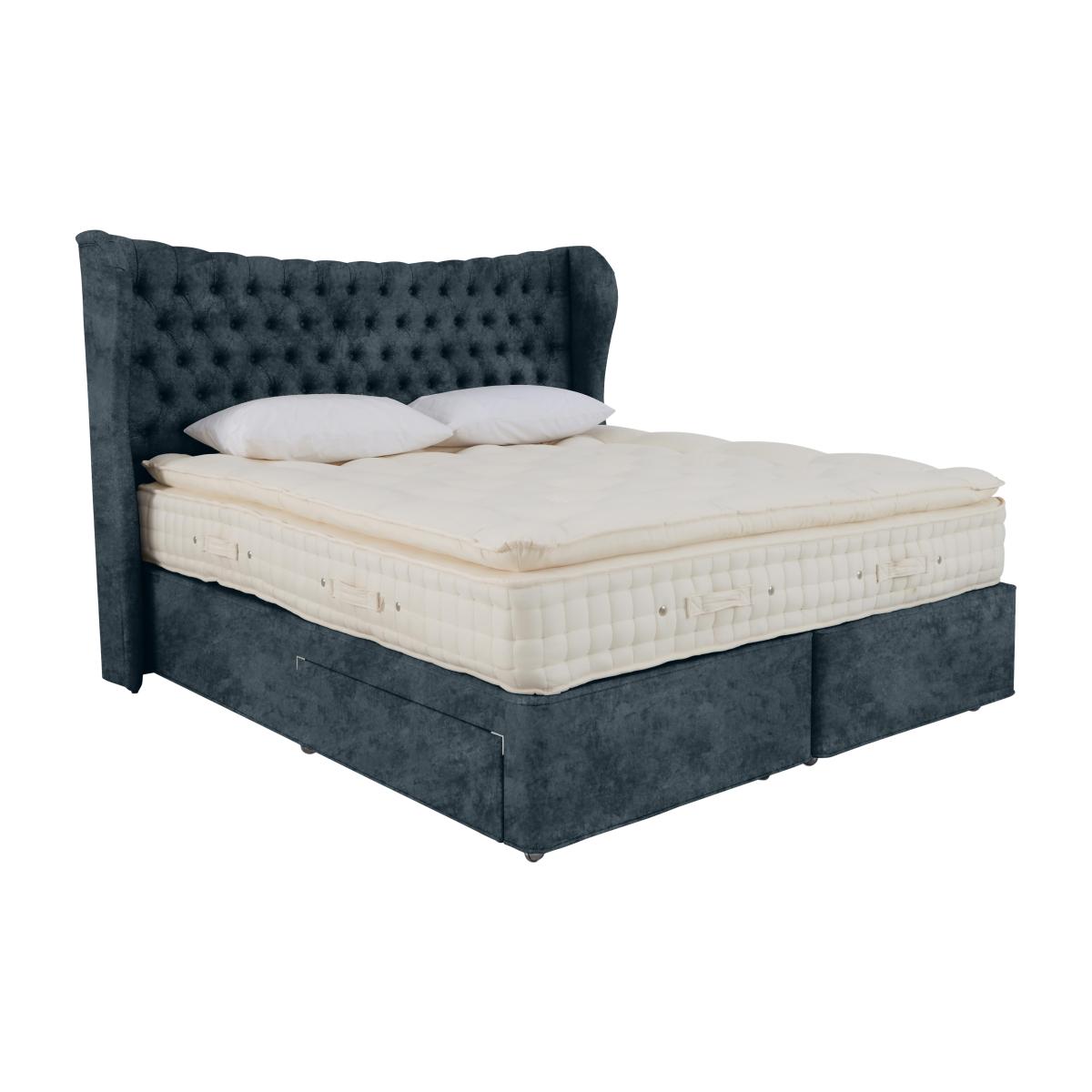 Discover the unparalleled comfort and support of the beautifully handcrafted Hypnos Bespoke Emperor range. This premium collection boasts a luxuriously comfortable pocket sprung, pillow top mattress with a stylish contemporary divan base and headboard that brings a touch of luxury to any bedroom. With Red Tractor-assured 100% British wool and all-natural fillings, its cosy layers of rich natural fillings support the body during sleep and ensure you wake up feeling rejuvenated every morning. Best of all, it offers a range of space-saving ottoman and drawer options for all your storage needs. The Hypnos Bespoke Emperor range is handcrafted in Britain by skilled artisan bedmakers exclusively for Furniture Village. Sleep like royalty with the luxurious, handcrafted Hypnos Bespoke Emperor Mattress with Divan Base. With its wide range of storage options, keeping your bedroom looking beautiful couldn’t be easier. Why you’ll love it Luxurious divan set with 3,300 pocket springs and pillow top. Space-saving ottoman and drawer storage options. Sumptuous layers of Red Tractor-assured 100% British wool and natural fillings. 100% sustainable and recyclable. Choose between a medium, firm or dual tension mattress. Available in a beautiful selection of colours and fabrics. Pairs beautifully with Hypnos headboards. Handmade in Britain by skilled artisans exclusively for Furniture Village. What you need to know Headboard shown is available seperately. Mattress type: Pocket spring Depth: 30 cm Firmness: Medium and firm. Springs: 3300 springs. Pillow top:Yes. Fillings: Red Tractor-assured 100% British wool, natural flax, hemp and cotton fillings. Cover: Cotton and viscose. Sizes: Super king, king, double, small double, single Requires turning: No, just rotate regularly. Storage:Yes. Ottoman and drawer options. Matress care: Please air your new mattress for four hours to remove any aroma from storage. It may take time for your mattress to attain its full size once the springs have settled to the correct position. Settlement of fillings and indentations caused by body weight compressing the fillings are natural and not considered defects. Be sure to rotate this mattress regularly.