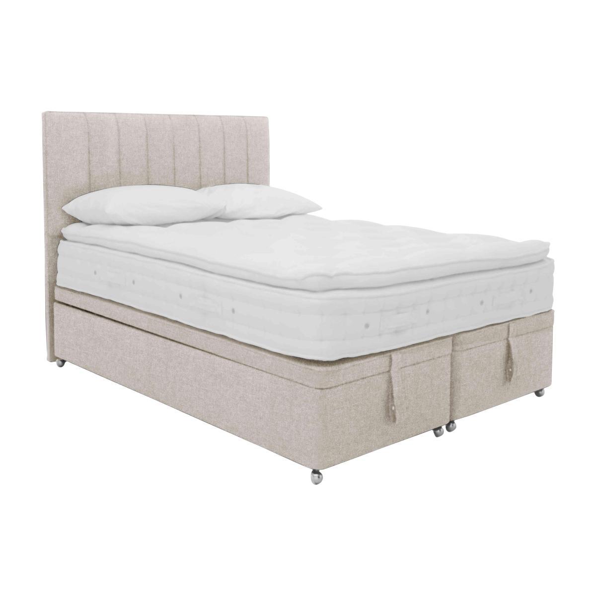 Enjoy luxurious pocket sprung comfort, and a healthier, cooler, fresher night’s sleep with the Hypnos Bespoke Finesse range. The medium comfort, rotatable, pillow top mattresses contain ingenious, innovative 37.5® temperature regulating technology – with a wool-rich comfort layer containing billions of active mineral particles which remove moisture and act as a natural thermostat. Expertly engineered pocket springs and layers of sumptuous fillings including British wool and sustainable cotton add to the all-embracing comfort. The beautifully upholstered divan bases have spacious end-ottoman storage. Exquisitely handcrafted in Britain by the skilled artisans at Hypnos, the Hypnos Bespoke Finesse range comes with a 20 year guarantee. Headboard is an optional extra. Stay fresh and cool with 37.5® temperature regulating technology. Medium feel mattress with 1200 ReActivePro™ 7-turn pocket springs. A luxurious pillow top mattress you don’t need to turn, just rotate regularly. Stylish end-lift ottoman base with plenty of hidden storage space. The Hypnos Bespoke Finesse divan set is luxurious, beautiful, comfortable and practical too. The luxury is its sumptuous layers of fillings, including sustainably sourced cotton and British wool. The beauty is the contemporary style and plush upholstery. The comfort is the innovative 37.5® wool rich comfort layer where billions of active mineral particles remove moisture and act as a thermostat, for a fresh and cooling sleep environment. Finally, the practicality is the spacious, hidden ottoman storage. A generous 31cm deep, the medium feel mattress has 1200 ReActivePro™ expertly engineered, responsive pocket springs, each with 7 active turns and Triple Edge Protection™ for complete support to the very edge of the bed. The cover of the mattress is tactile, soft unbleached cotton made naturally fire-resistant. The platform top, ottoman divan base is built from sturdy FSC®-certified Scandinavian pine upholstered in a choice of plush, fine fabrics. The Hypnos Bespoke collection allows you to pair any mattress with any divan base. The Bespoke Finesse divan set is handcrafted in the UK by Royal Warrant holders Hypnos, and has a 20 year guarantee. Product images are representative. Find out more. Did you know?. The Finesse mattress is a pillow top mattress you don’t need to turn it, just rotate it regularly. Please air the mattress for four hours after delivery to freshen and remove any aroma from storage. It may take time for your mattress to attain its full size once the springs have settled to the correct position. This is due to the mattress being upright during transit. Settlement of fillings and indentations caused by body weight compressing the fillings are natural and not considered defects. This can be minimised by regular rotating.