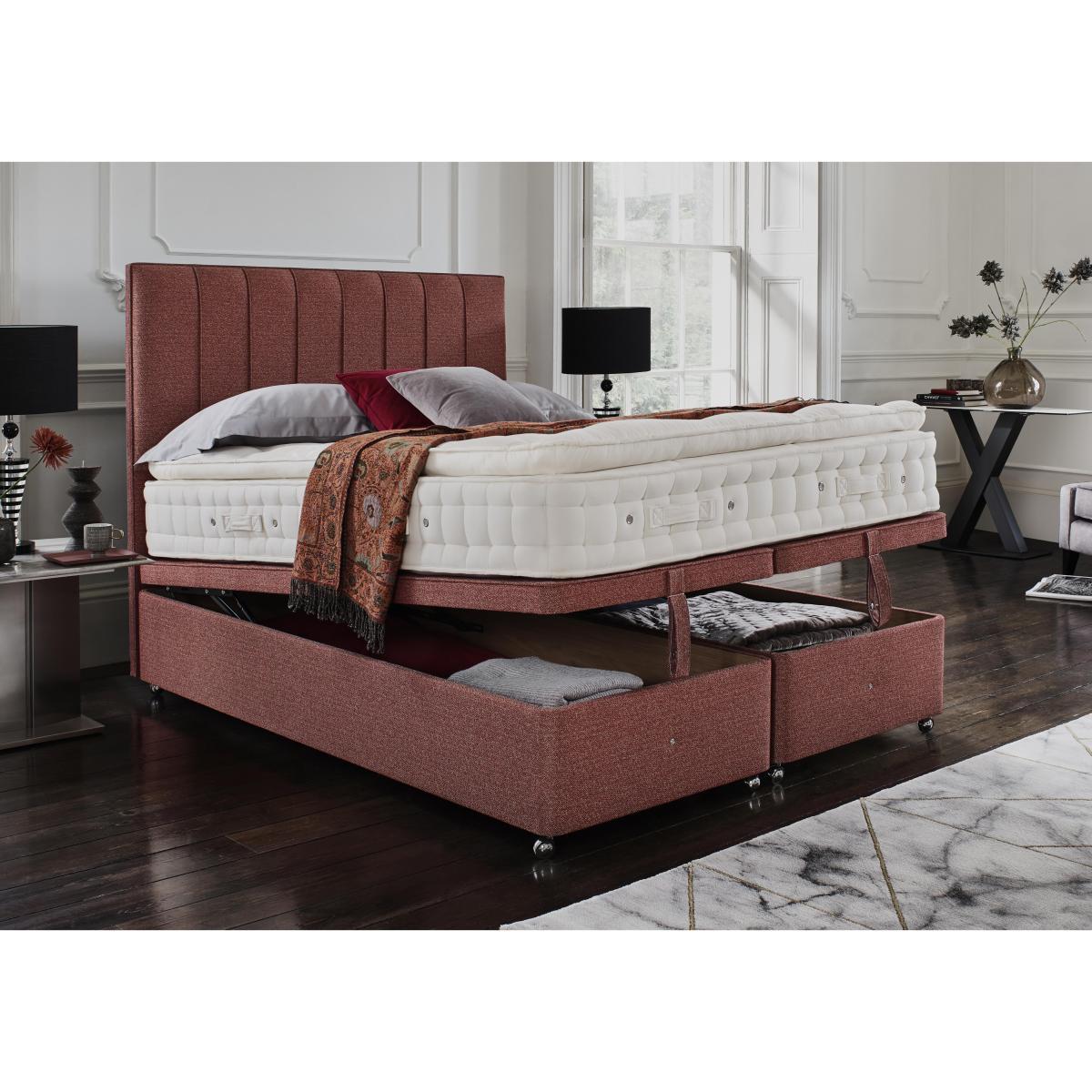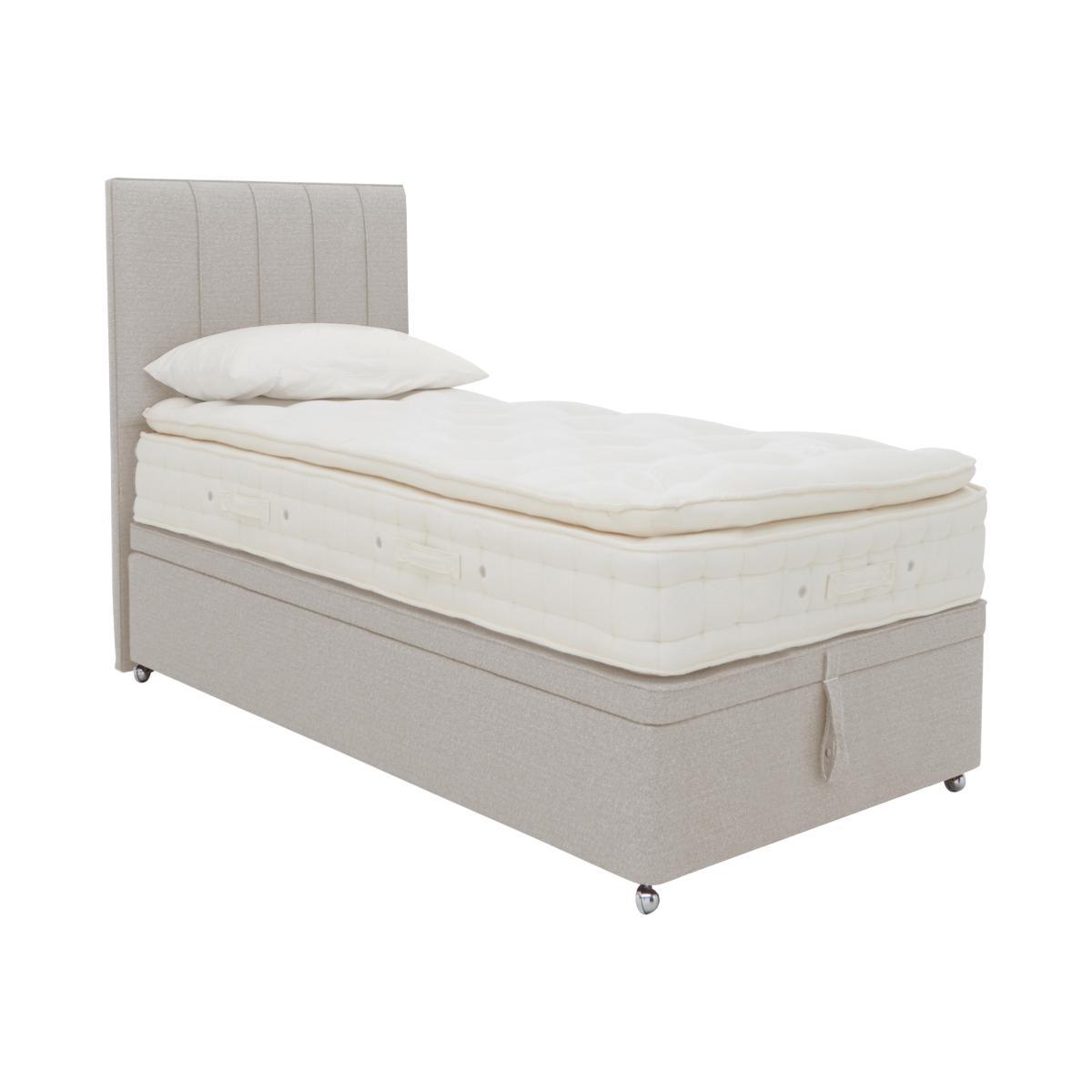 Enjoy luxurious pocket sprung comfort, and a healthier, cooler, fresher night’s sleep with the Hypnos Bespoke Finesse range. The medium comfort, rotatable, pillow top mattresses contain ingenious, innovative 37.5® temperature regulating technology – with a wool-rich comfort layer containing billions of active mineral particles which remove moisture and act as a natural thermostat. Expertly engineered pocket springs and layers of sumptuous fillings including British wool and sustainable cotton add to the all-embracing comfort. The beautifully upholstered divan bases have spacious end-ottoman storage. Exquisitely handcrafted in Britain by the skilled artisans at Hypnos, the Hypnos Bespoke Finesse range comes with a 20 year guarantee. Headboard is an optional extra. Stay fresh and cool with 37.5® temperature regulating technology. Medium feel mattress with 1200 ReActivePro™ 7-turn pocket springs. A luxurious pillow top mattress you don’t need to turn, just rotate regularly. Stylish end-lift ottoman base with plenty of hidden storage space. The Hypnos Bespoke Finesse divan set is luxurious, beautiful, comfortable and practical too. The luxury is its sumptuous layers of fillings, including sustainably sourced cotton and British wool. The beauty is the contemporary style and plush upholstery. The comfort is the innovative 37.5® wool rich comfort layer where billions of active mineral particles remove moisture and act as a thermostat, for a fresh and cooling sleep environment. Finally, the practicality is the spacious, hidden ottoman storage. A generous 31cm deep, the medium feel mattress has 1200 ReActivePro™ expertly engineered, responsive pocket springs, each with 7 active turns and Triple Edge Protection™ for complete support to the very edge of the bed. The cover of the mattress is tactile, soft unbleached cotton made naturally fire-resistant. The platform top, ottoman divan base is built from sturdy FSC®-certified Scandinavian pine upholstered in a choice of plush, fine fabrics. The Hypnos Bespoke collection allows you to pair any mattress with any divan base. The Bespoke Finesse divan set is handcrafted in the UK by Royal Warrant holders Hypnos, and has a 20 year guarantee. Product images are representative. Find out more. Did you know?. The Finesse mattress is a pillow top mattress you don’t need to turn it, just rotate it regularly. Please air the mattress for four hours after delivery to freshen and remove any aroma from storage. It may take time for your mattress to attain its full size once the springs have settled to the correct position. This is due to the mattress being upright during transit. Settlement of fillings and indentations caused by body weight compressing the fillings are natural and not considered defects. This can be minimised by regular rotating.