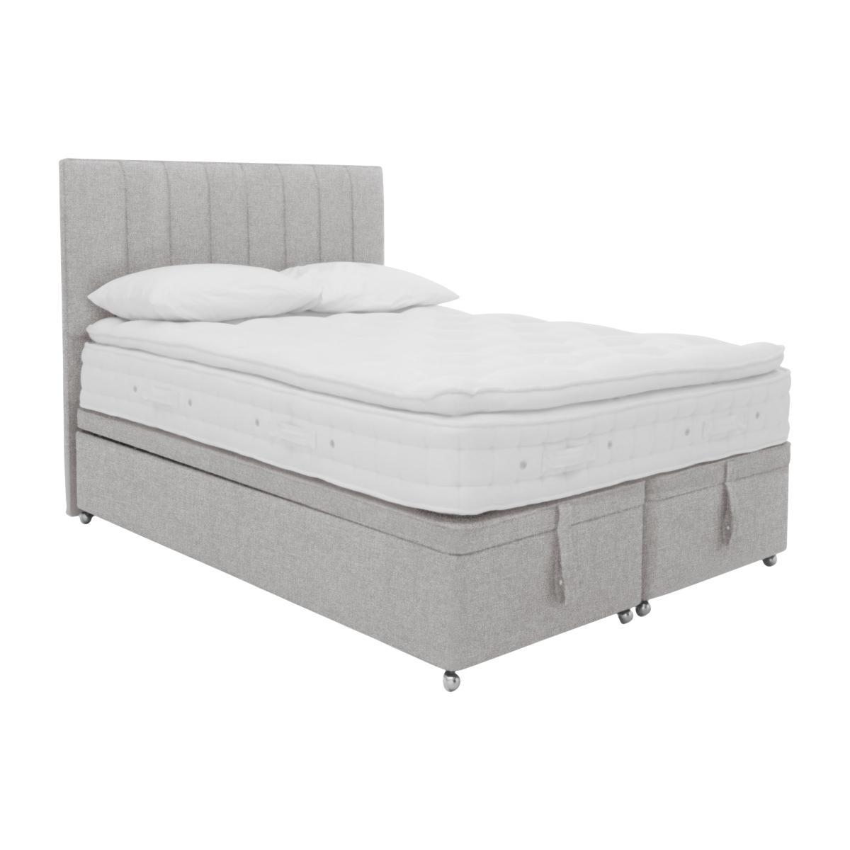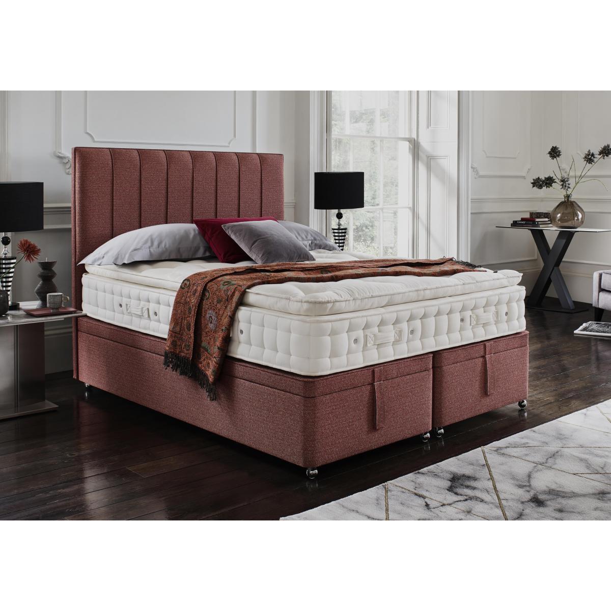 . Stay fresh and cool with 37. 5 temperature regulating technology Medium feel mattress with 1200 ReActivePro 7- turn pocket springs A luxurious pillow top mattress you dont need to turn, just rotate regularly Stylish end- lift ottoman base with plenty of hidden storage space The Hypnos Bespoke Finesse divan set is luxurious, beautiful, comfortable and practical too. The luxury is its sumptuous layers of fillings, including sustainably sourced cotton and British wool. The beauty is the contemporary style and plush upholstery. The comfort is the innovative 37. 5 wool rich comfort layer where billions of active mineral particles remove moisture and act as a thermostat, for a fresh and cooling sleep environment. Finally, the practicality is the spacious, hidden ottoman storage. A generous 31cm deep, the medium feel mattress has 1200 ReActivePro expertly engineered, responsive pocket springs, each with 7 active turns and Triple Edge Protection for complete support to the very edge of the bed. The cover of the mattress is tactile, soft unbleached cotton made naturally fire- resistant. The platform top, ottoman divan base is built from sturdy FSC- certified Scandinavian pine upholstered in a choice of plush, fine fabrics. The Hypnos Bespoke collection allows you to pair any mattress with any divan base. The Bespoke Finesse divan set is handcrafted in the UK by Royal Warrant holders Hypnos, and has a 20 year guarantee. Product images are representative. Find out more. Did you know? The Finesse mattress is a pillow top mattress you dont need to turn it, just rotate it regularly. Please air the mattress for four hours after delivery to freshen and remove any aroma from storage. It may take time for your mattress to attain its full size once the springs have settled to the correct position. This is due to the mattress being upright during transit. Settlement of fillings and indentations caused by body weight compressing the fillings are natural and not considered defects. This can be minimised by regular rotating.
