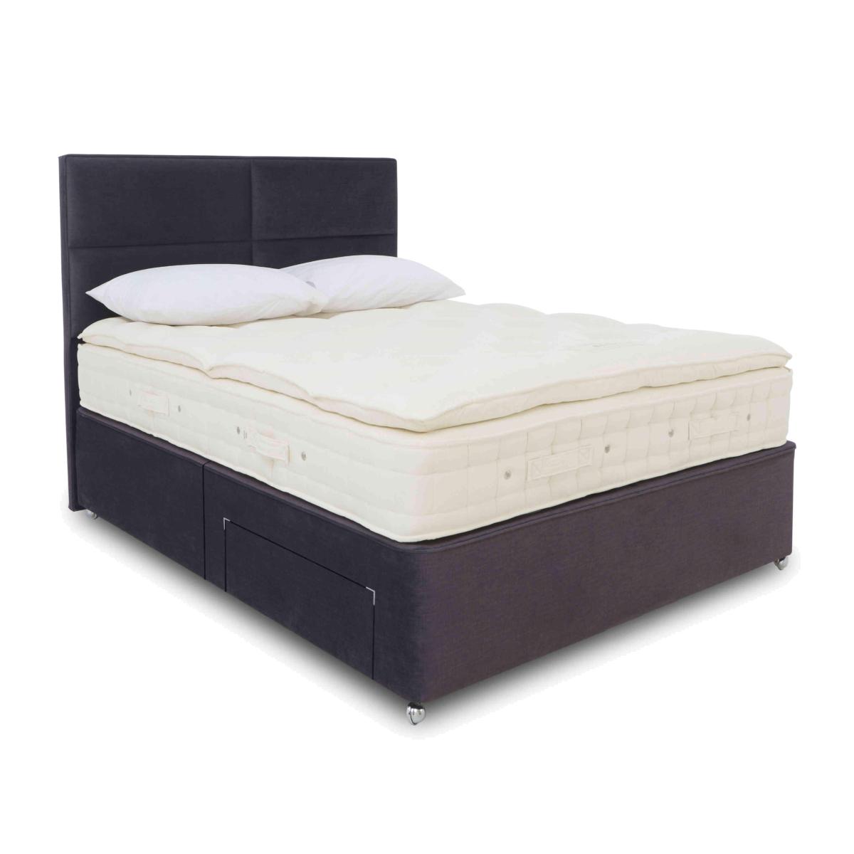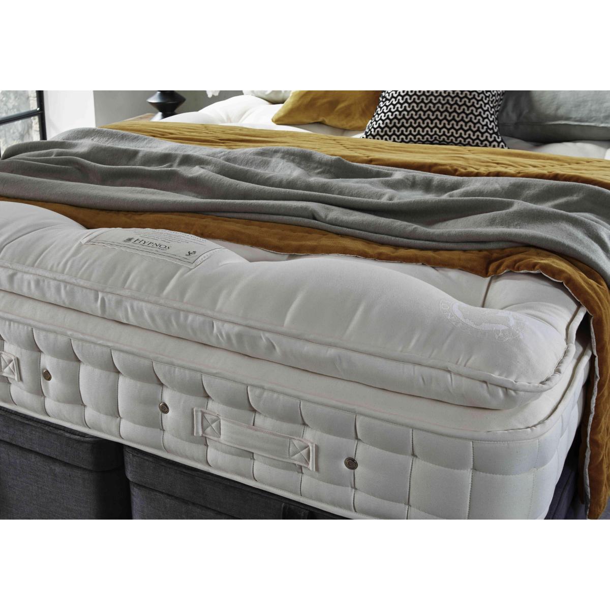 Enjoy luxurious pocket sprung comfort, and a healthier, cooler, fresher night’s sleep with the Hypnos Bespoke Finesse range. The medium comfort, rotatable, pillow top mattresses contain ingenious, innovative 37.5® temperature regulating technology – with a wool-rich comfort layer containing billions of active mineral particles which remove moisture and act as a natural thermostat. Expertly engineered pocket springs and layers of sumptuous fillings including British wool and sustainable cotton add to the all-embracing comfort. The beautifully upholstered divan bases have spacious end-ottoman storage. Exquisitely handcrafted in Britain by the skilled artisans at Hypnos, the Hypnos Bespoke Finesse range comes with a 20 year guarantee. We’ve paired this luxurious pillow top mattress with a beautifully upholstered divan base with optional storage drawers. Handcrafted by Hypnos, this divan set is exclusive to Furniture Village. Why you'll love it Sumptuous Hypnos divan set includes a naturally cooling, cloud-like pillow top mattress. With mini springs and natural fillings, the cushioning pillow top feels amazing. Luxurious top layer is made of plush Solotex™. Designed for cooling comfort with a Red Tractor-assured wool-rich layer. ReActivePro™ 7-turn pocket springs provide responsive medium-feel support. Plus a layer of Adaptiv™ springs that flex with your body for personalised comfort. Sustainably sourced cotton fillings for natural softness. Chemical-free and fire-resistant cover is made with unbleached cotton. Border has 2 rows of hand side-stitching for extra strength and support. Traditionally hand tufted with wool tufts. Divan base is made of FSC®-certified Scandinavian pine. With optional storage drawers and in a huge choice of upholstery fabrics. Handcrafted in the UK by Royal Warrant-holder Hypnos. Made exclusively for Furniture Village. This divan set is part of our Hypnos Bespoke Finesse range. What you need to know Headboard not included. Mattress type: Pocket spring. Depth: 31 cm. Firmness: Medium. Springs: 1,200 ReActivePro™ 7-turn pocket springs and 1,500 Adaptiv™ comfort springs in king size. Pillow top:Yes. Fillings: Red Tractor-assured wool, cotton, polyester. Cover: Cotton and viscose. Requires turning: No. Base type: Platform top with optional storage drawers. Sizes:Single, small double, double, king, super king. Mattress care:Air for 4 hours before using to remove any odour. Allow at least 4 hours for springs to settle and for mattress to attain its full size. Indentations caused by settlement of fillings or body weight are normal and are not considered defects. If used on a slatted bed frame, the space between slats must be no wider than 7.5 cm. Spaces wider than this may cause excess dipping of the mattress and invalidate the guarantee. Always use a mattress protector. Rotate regularly. Divan base care: Clean upholstery weekly using a soft brush or vacuum with the curtain attachment. Professional cleaning advised for oil- and grease-based stains. Some fabrics can show wear on areas of more use or in direct sunlight.