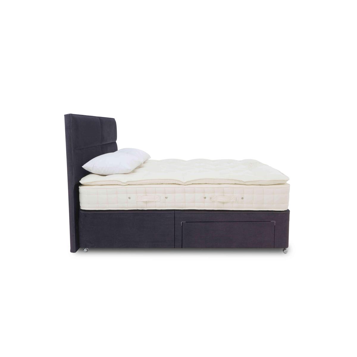 Enjoy luxurious pocket sprung comfort, and a healthier, cooler, fresher night’s sleep with the Hypnos Bespoke Finesse range. The medium comfort, rotatable, pillow top mattresses contain ingenious, innovative 37.5® temperature regulating technology – with a wool-rich comfort layer containing billions of active mineral particles which remove moisture and act as a natural thermostat. Expertly engineered pocket springs and layers of sumptuous fillings including British wool and sustainable cotton add to the all-embracing comfort. The beautifully upholstered divan bases have spacious end-ottoman storage. Exquisitely handcrafted in Britain by the skilled artisans at Hypnos, the Hypnos Bespoke Finesse range comes with a 20 year guarantee. We’ve paired this luxurious pillow top mattress with a beautifully upholstered divan base with optional storage drawers. Handcrafted by Hypnos, this divan set is exclusive to Furniture Village. Why you'll love it Sumptuous Hypnos divan set includes a naturally cooling, cloud-like pillow top mattress. With mini springs and natural fillings, the cushioning pillow top feels amazing. Luxurious top layer is made of plush Solotex™. Designed for cooling comfort with a Red Tractor-assured wool-rich layer. ReActivePro™ 7-turn pocket springs provide responsive medium-feel support. Plus a layer of Adaptiv™ springs that flex with your body for personalised comfort. Sustainably sourced cotton fillings for natural softness. Chemical-free and fire-resistant cover is made with unbleached cotton. Border has 2 rows of hand side-stitching for extra strength and support. Traditionally hand tufted with wool tufts. Divan base is made of FSC®-certified Scandinavian pine. With optional storage drawers and in a huge choice of upholstery fabrics. Handcrafted in the UK by Royal Warrant-holder Hypnos. Made exclusively for Furniture Village. This divan set is part of our Hypnos Bespoke Finesse range. What you need to know Headboard not included. Mattress type: Pocket spring. Depth: 31 cm. Firmness: Medium. Springs: 1,200 ReActivePro™ 7-turn pocket springs and 1,500 Adaptiv™ comfort springs in king size. Pillow top:Yes. Fillings: Red Tractor-assured wool, cotton, polyester. Cover: Cotton and viscose. Requires turning: No. Base type: Platform top with optional storage drawers. Sizes:Single, small double, double, king, super king. Mattress care:Air for 4 hours before using to remove any odour. Allow at least 4 hours for springs to settle and for mattress to attain its full size. Indentations caused by settlement of fillings or body weight are normal and are not considered defects. If used on a slatted bed frame, the space between slats must be no wider than 7.5 cm. Spaces wider than this may cause excess dipping of the mattress and invalidate the guarantee. Always use a mattress protector. Rotate regularly. Divan base care: Clean upholstery weekly using a soft brush or vacuum with the curtain attachment. Professional cleaning advised for oil- and grease-based stains. Some fabrics can show wear on areas of more use or in direct sunlight.