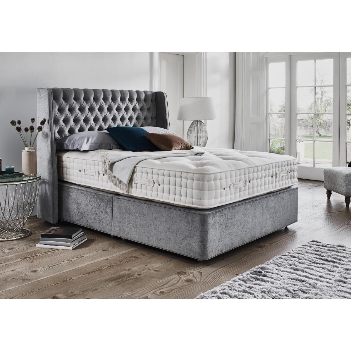 All embracing, head-to-toe luxury with 100% eco-friendly credentials – introducing the Hypnos Bespoke Grandeur range. Enjoy an all-natural, fresh and cooling night’s sleep with sumptuous layers of pure British wool and the responsive support of 1800 expertly engineered pocket springs. The turnable mattresses, in a choice of medium, firm or split comfort levels, are rich in 100% British wool responsibly sourced from Red Tractor assured farms with guaranteed traceability. Wool is temperature regulating and antibacterial creating the perfect environment for a refreshing and healthy night’s sleep, the natural way. A layer of all-natural latex adds to the all-embracing comfort of these top-of-the-range mattresses. The exquisitely upholstered divan bases have a choice of drawer storage. Expertly crafted Britain by the skilled artisans at Hypnos, the Hypnos Bespoke Grandeur range comes with a 20 year guarantee. Headboard is an optional extra. Rich in luxurious, temperature regulating, 100% British wool. Firm or medium feel mattress with 1800 ReActivePro™ 10-turn pocket springs. Turnable mattress, turn with the seasons for long-lasting comfort. Plush upholstered sprung base with a choice of drawer options. The Hypnos Bespoke Grandeur divan set offers the ultimate in luxury and comfort. Fillings include a layer of springy, all natural latex, sustainably sourced cotton and sumptuous layers of pure wool, sourced from Red Tractor assured farms with guaranteed traceability. Wool is a natural temperature regulator, transporting heat away from your body when you are too warm and insulating you when you are cold. Choose your comfort level – medium or firm, or medium on one side and firm on the other. A generous 30cm deep, the mattress has 1800 ReActivePro™ expertly engineered pocket springs, each with 10 active turns for incredibly responsive, pressure relieving support. And thanks to the Triple Edge Protection™ this all-embracing support extends to the very edge of the bed. The soft-touch mattress cover is unbleached cotton made to be naturally fire-resistant. The sprung divan base has a choice of drawer storage. Built from sturdy FSC-certified Scandinavian pine it’s upholstered in a choice of beautiful fabrics. Product images are representative. Find out more. The Hypnos Bespoke collection allows you to pair any mattress with any divan base and headboard. The Bespoke Grandeur divan set is beautifully handcrafted in Britain by the skilled artisans at Royal Warrant holders Hypnos. Product images are representative. Find out more. Did you know?. The Grandeur mattress is turnable, turn with the seasons for long-lasting comfort. Please air the mattress for four hours after delivery to freshen and remove any aroma from storage. It may take time for your mattress to attain its full size once the springs have settled to the correct position. This is due to the mattress being upright during transit. Settlement of fillings and indentations caused by body weight compressing the fillings are natural and not considered defects. This can be minimised by regular rotating.