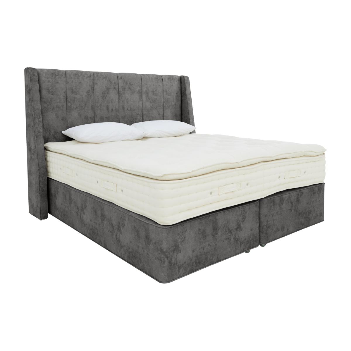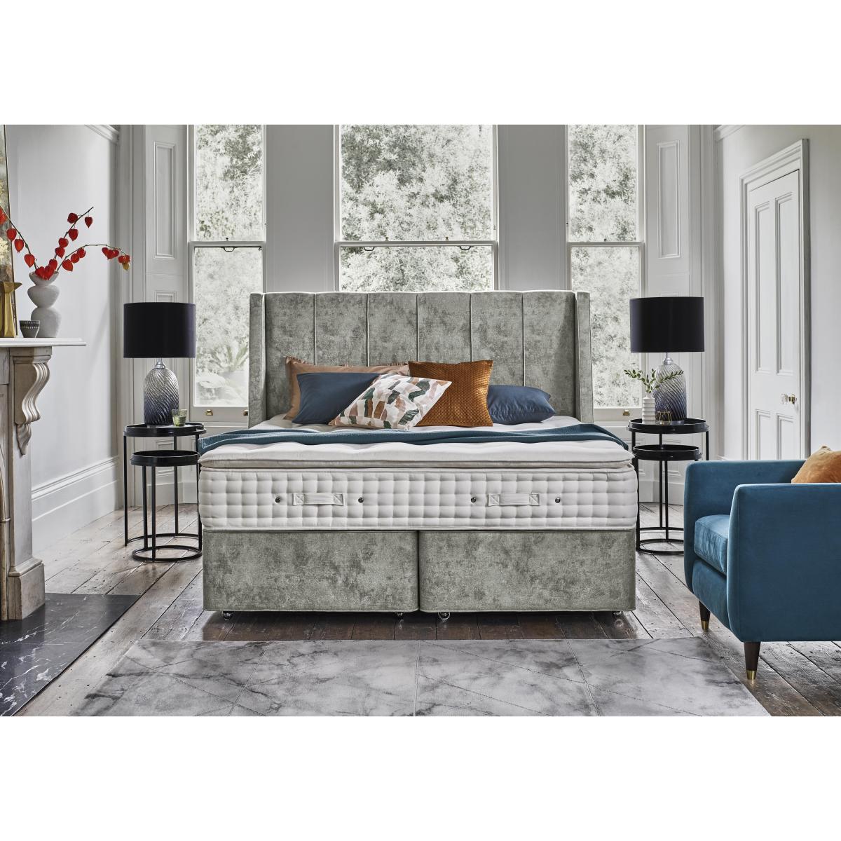 With a sprung-edge base and superb pocket sprung pillowtop mattress, this Hypnos divan set is the perfect combination of superior support and luxury comfort. Why you'll love it With a sprung-edge edge base and superb mattress, this divan promises wonderful support. Mattress delivers pocket spring comfort with a cushioning pillow top. Its ReActivePro™ pocket springs have up to 10 active turns for a more responsive feel. Layered with generous layers of temperature-regulating natural fillings including latex.. Sprung pillowtop is filled with Red Tractor-assured wool, and all-natural nettle and cotton. Triple Edge Protection™ and 4 rows of hand side stitching for superior edge support. In medium and firm tension. Dual medium/firm tension available in king and super king sizes. Sprung-edge divan base for exceptional edge-to-edge mattress support. Choice of storage options including drawers, ottoman and hideaway base. In a huge choice of colours to match any decor. Platform-top base also available. Handcrafted in England and only at Furniture Village. This divan set is part of the Hypnos Bespoke Monarch range. What you need to know Headboard is the Hypnos Longwick Floor Standing Headboard, available separately. Mattress type: Pocket spring. Firmness: Medium and firm. Dual tension available in king and super king sizes. Springs: 1800 in king size. Pillow top:Yes. Fillings: Latex, polyester. Cover: Damask. Requires turning: No. Base type: Sprung-edge and platform-top with optional storage. Sizes: Double, king, super king. Mattress care:Air for 4 hours before using to remove any odour. Allow at least 4 hours for springs to settle and for mattress to attain its full size. Indentations caused by settlement of fillings or body weight are normal and are not considered defects. If used on a slatted bed frame, the space between slats must be no wider than 7.5 cm. Spaces wider than this may cause excess dipping of the mattress and invalidate the guarantee. Always use a mattress protector. Rotate regularly. Divan base care: Clean upholstery weekly using a soft brush or vacuum with the curtain attachment. Professional cleaning advised for oil- and grease-based stains. Some fabrics can show wear on areas of more use or in direct sunlight.