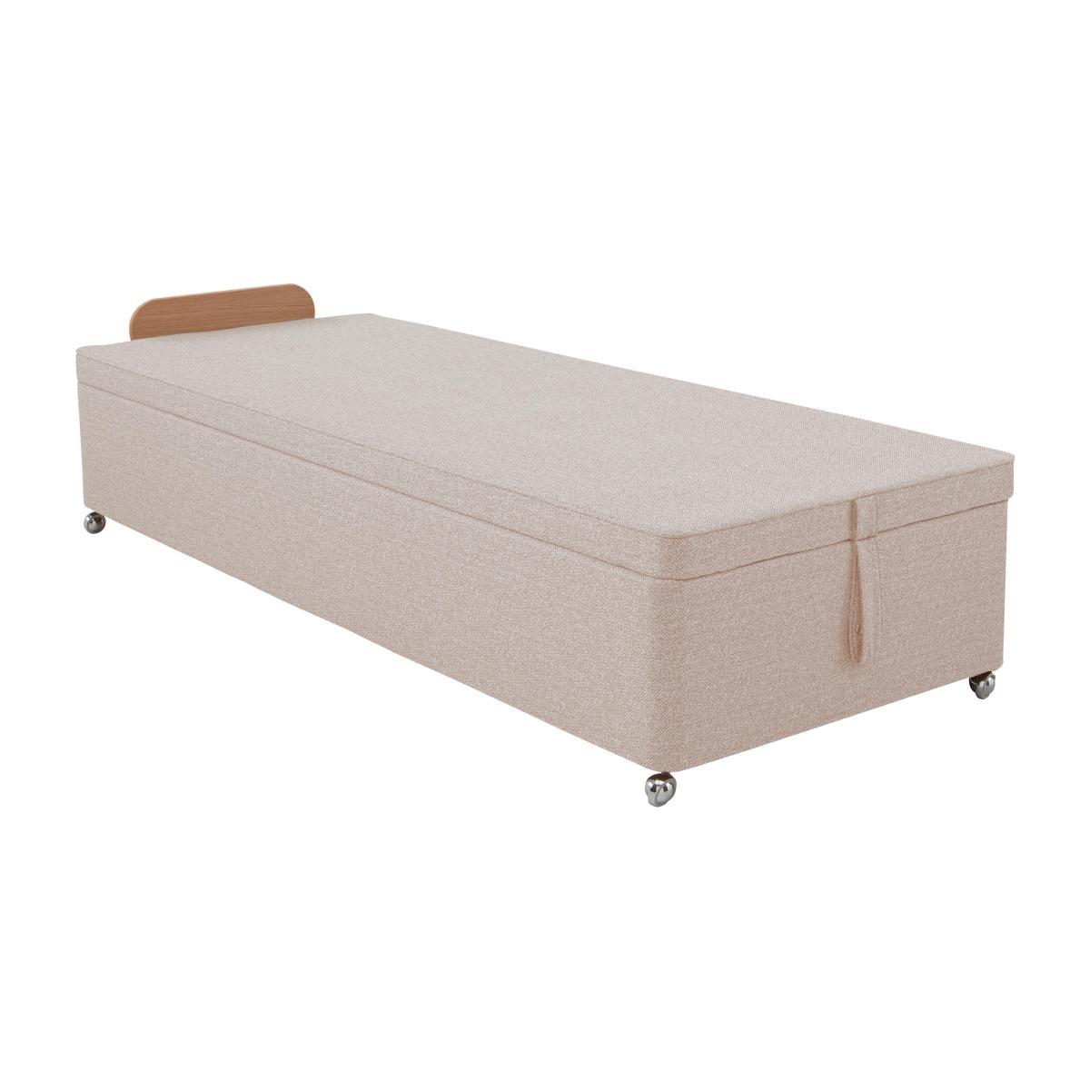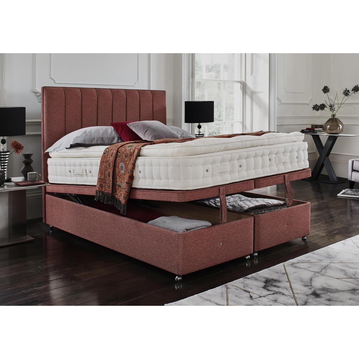 Looking for extra bedroom storage? We’ve found it – under the top of this beautifully handcrafted upholstered divan base from Hypnos. A Furniture Village exclusive. Why you'll love it. Luxury handcrafted divan base by Hypnos. Understated contemporary design. Traditional solid top divan base for a firmer feel. Features a large end-lift ottoman storage space. Hydraulic springs ensure easy access to the storage compartment. Made from FSC-certified timber and 100% sustainable – it’s even recyclable. Choose from a huge range of upholstery fabrics and colours. Available in all standard bed sizes from single to super king. Designed to pair with a Hypnos headboard. Handmade in Britain by skilled craftspeople using time-honoured techniques. Exclusively available at Furniture Village. What you need to know. Headboard shown is available separately. Mattress not included. Compatible with floorstanding and strutted headboards. Clean weekly using a soft brush or vacuum with the curtain attachment. Annual professional cleaning is recommended. Some fabrics can show wear on areas of more use or in direct sunlight. Part of the Hypnos Bespoke collection of beautiful divan bases.