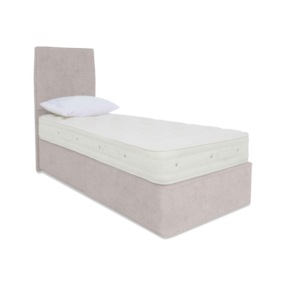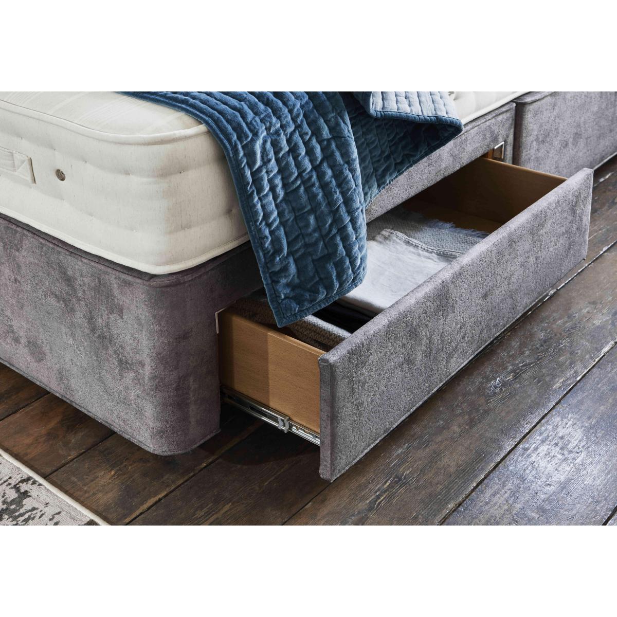 Luxury comfort and firm support come together beautifully in the Hypnos Luxury Firm collection. Alongside superior craftsmanship and exceptional quality, this collection gives firm-mattress seekers something else – outstanding choice. The collection comprises four ranges – Hypnos Luxury Firm 1, Hypnos Luxury Firm 2, Hypnos Luxury Firm 3 and Hypnos Luxury Firm 4 – each of which offers a different combination of firm or extra-firm support and sumptuous comfort with layers of ReActive™ 6-turn pocket springs, cooling British-certified wool, and all-natural fillings. Shop the complete Luxury Firm collection for mattresses and divan sets with ottoman storage, hideaway storage and optional drawers. Handcrafted in the UK exclusively for Furniture Village. If you sleep better on an extra-firm mattress, you’ll get that and so much more when you choose this stylish divan set by Hypnos. Only at Furniture Village. Why you'll love it True support, luxury feel – that’s this lovely Hypnos divan set with mattress. A unique combination of luxurious comfort and extra-firm support. 1,200 ReActive™ 6-turn pocket springs in king size respond to your shape and weight. Layers of temperature-regulating wool, cotton, hemp and comfort fibres. Chemical-free linen and cotton sleep surface. Traditionally crafted with tufting and 2 rows of side stitching. Set on a supportive platform top base with optional storage drawers. Wide choice of upholstery fabrics. Handmade in the UK by Hypnos exclusively for Furniture Village. This divan set is part of the Hypnos Luxury Firm 2 range. What you need to know Mattress type: Pocket spring. Depth: 27 cm. Firmness: Extra firm. Springs: 1,200 ReActive™ 6-turn pocket springs in king size. Pillow top: No. Fillings: British certified wool; responsibly sourced cotton and hemp; e. Olus™ recycled comfort fibres. Cover: Cotton, flax. Requires turning: No. Base type: Platform top with optional storage drawers. Not all drawer options are available in all sizes. Sizes: Single, small double, double, king, super king. Mattress care:Air for 4 hours before using to remove any odour. Allow at least 4 hours for springs to settle and for mattress to attain its full size. Indentations caused by settlement of fillings or body weight are normal and are not considered defects. If used on a slatted bed frame, the space between slats must be no wider than 7.5 cm. Spaces wider than this may cause excess dipping of the mattress and invalidate the guarantee. Always use a mattress protector. Rotate regularly. Divan base care: Clean upholstery weekly using a soft brush or vacuum with the curtain attachment. Professional cleaning advised for oil- and grease-based stains. Some fabrics can show wear on areas of more use or in direct sunlight.