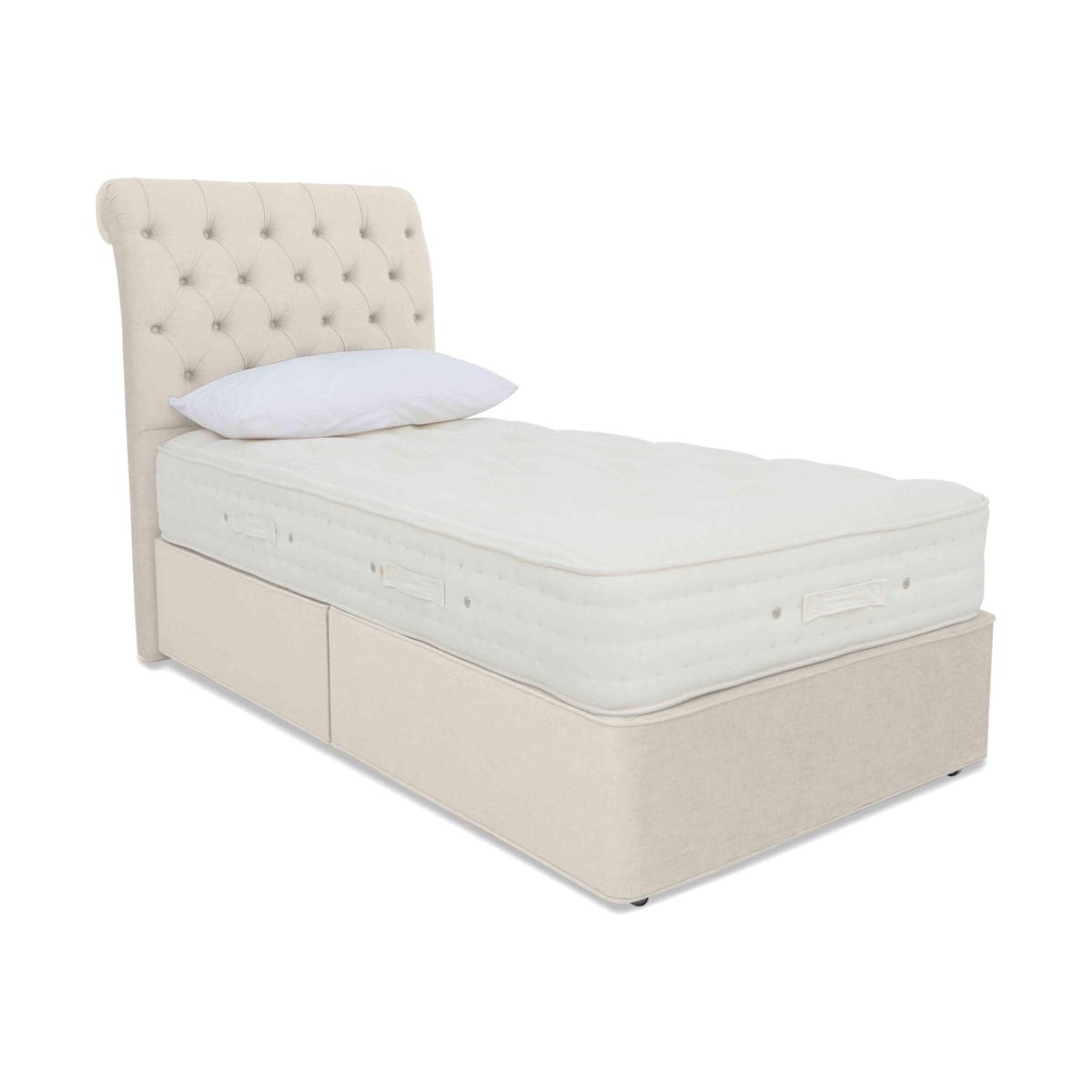Luxury comfort and firm support come together beautifully in the Hypnos Luxury Firm collection. Alongside superior craftsmanship and exceptional quality, this collection gives firm-mattress seekers something else – outstanding choice. The collection comprises four ranges – Hypnos Luxury Firm 1, Hypnos Luxury Firm 2, Hypnos Luxury Firm 3 and Hypnos Luxury Firm 4 – each of which offers a different combination of firm or extra-firm support and sumptuous comfort with layers of ReActive™ 6-turn pocket springs, cooling British-certified wool, and all-natural fillings. Shop the complete Luxury Firm collection for mattresses and divan sets with ottoman storage, hideaway storage and optional drawers. Handcrafted in the UK exclusively for Furniture Village. With temperature-regulating fillings and firmer-feel pocket spring support, the mattress in this Hypnos divan set is designed for better sleep. Only at Furniture Village. Why you'll love it The mattress in this divan set offers cooling fillings and real pocket spring support. A unique combination of luxurious comfort and firmer-feel support. 1,400 ReActive™ 6-turn pocket springs in king size respond to your shape and weight. Layers of temperature-regulating wool and flax, plus cotton and comfort fibres. Chemical-free linen and cotton sleep surface. Traditionally crafted with tufting and 3 rows of side stitching. Set on a supportive platform top base with optional storage drawers. Wide choice of upholstery fabrics. Handmade in the UK by Hypnos exclusively for Furniture Village. This divan set is part of the Hypnos Luxury Firm 3 range. What you need to know Mattress type: Pocket spring. Depth: 29 cm. Firmness: Firm. Springs: 1,400 ReActive™ 6-turn pocket springs in king size. Pillow top: No. Fillings: British certified wool; responsibly sourced cotton and flax; e. Olus™ recycled comfort fibres. Cover: Cotton, flax. Requires turning: No. Base type: Platform top with optional storage drawers. Not all drawer options are available in all sizes. Sizes: Single, small double, double, king, super king. Mattress care:Air for 4 hours before using to remove any odour. Allow at least 4 hours for springs to settle and for mattress to attain its full size. Indentations caused by settlement of fillings or body weight are normal and are not considered defects. If used on a slatted bed frame, the space between slats must be no wider than 7.5 cm. Spaces wider than this may cause excess dipping of the mattress and invalidate the guarantee. Always use a mattress protector. Rotate regularly. Divan base care: Clean upholstery weekly using a soft brush or vacuum with the curtain attachment. Professional cleaning advised for oil- and grease-based stains. Some fabrics can show wear on areas of more use or in direct sunlight.