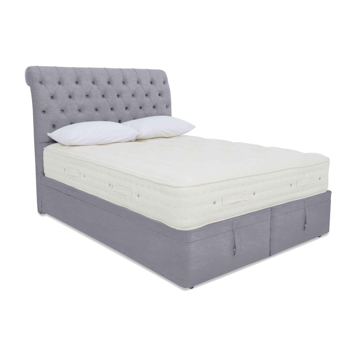 Luxury comfort and firm support come together beautifully in the Hypnos Luxury Firm collection. Alongside superior craftsmanship and exceptional quality, this collection gives firm-mattress seekers something else – outstanding choice. The collection comprises four ranges – Hypnos Luxury Firm 1, Hypnos Luxury Firm 2, Hypnos Luxury Firm 3 and Hypnos Luxury Firm 4 – each of which offers a different combination of firm or extra-firm support and sumptuous comfort with layers of ReActive™ 6-turn pocket springs, cooling British-certified wool, and all-natural fillings. Shop the complete Luxury Firm collection for mattresses and divan sets with ottoman storage, hideaway storage and optional drawers. Handcrafted in the UK exclusively for Furniture Village. Made to maximise your bedroom storage space, this Hypnos ottoman divan set includes a wonderful firmer-feel pocket spring mattress with high-quality cooling fillings. Why you'll love it Storage-rich ottoman divan set comes with ultra-supportive pocket spring mattress. A unique combination of luxurious comfort and firmer-feel support. 1,400 ReActive™ 6-turn pocket springs in king size respond to your shape and weight. Layers of temperature-regulating wool and flax, plus cotton and comfort fibres. Chemical-free linen and cotton sleep surface. Traditionally crafted with tufting and 3 rows of side stitching. Set on a supportive platform top base with spacious ottoman storage. Wide choice of upholstery fabrics. Handmade in the UK by Hypnos exclusively for Furniture Village. This ottoman divan set is part of the Hypnos Luxury Firm 3 range. What you need to know Mattress type: Pocket spring. Depth: 29 cm. Firmness: Firm. Springs: 1,400 ReActive™ 6-turn pocket springs in king size. Pillow top: No. Fillings: British certified wool; responsibly sourced cotton and flax; e. Olus™ recycled comfort fibres. Cover: Cotton, flax. Requires turning: No. Base type: Platform top with ottoman storage. Sizes: Single, double, king, super king. Mattress care:Air for 4 hours before using to remove any odour. Allow at least 4 hours for springs to settle and for mattress to attain its full size. Indentations caused by settlement of fillings or body weight are normal and are not considered defects. If used on a slatted bed frame, the space between slats must be no wider than 7.5 cm. Spaces wider than this may cause excess dipping of the mattress and invalidate the guarantee. Always use a mattress protector. Rotate regularly. Divan base care: Clean upholstery weekly using a soft brush or vacuum with the curtain attachment. Professional cleaning advised for oil- and grease-based stains. Some fabrics can show wear on areas of more use or in direct sunlight.