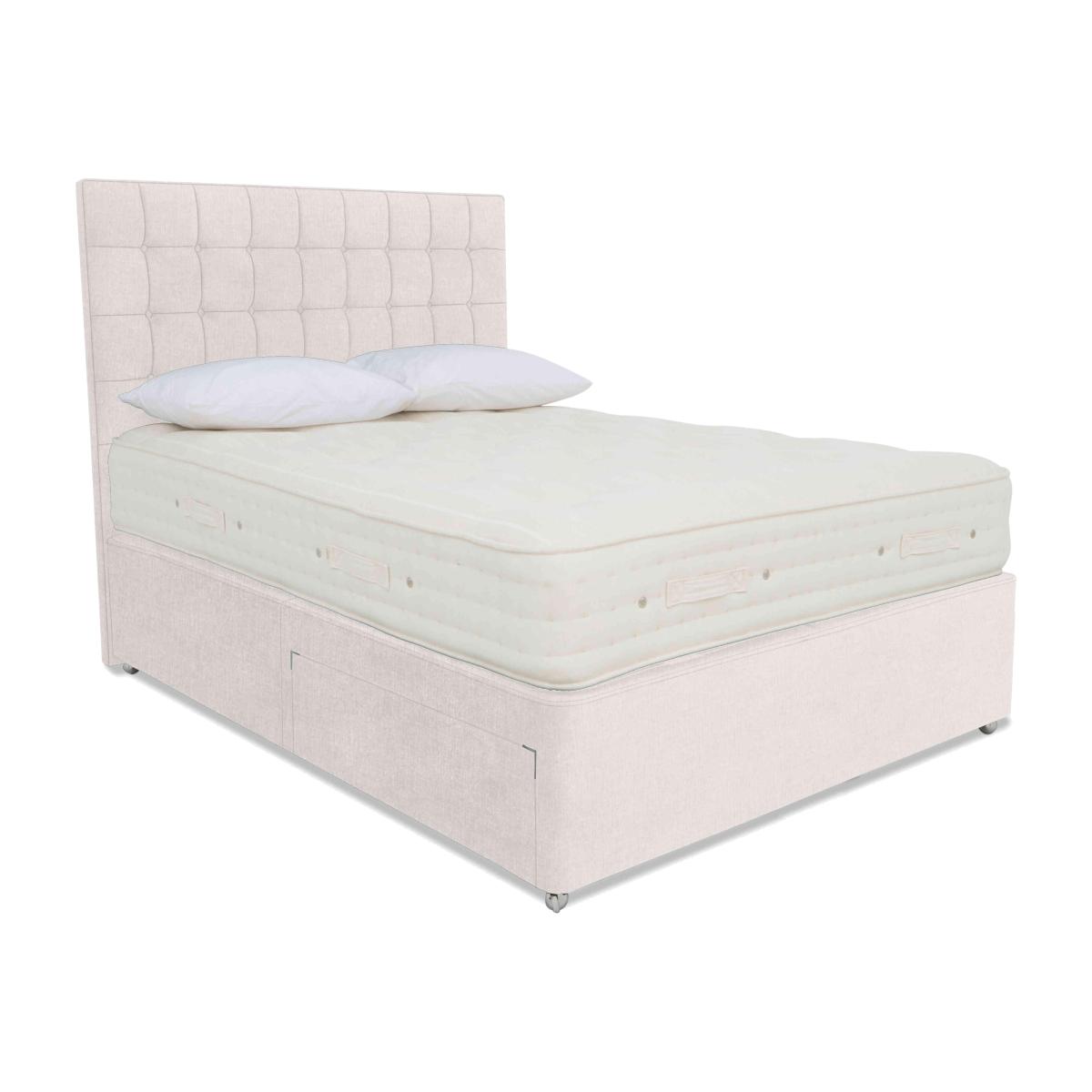Luxury comfort and firm support come together beautifully in the Hypnos Luxury Firm collection. Alongside superior craftsmanship and exceptional quality, this collection gives firm-mattress seekers something else – outstanding choice. The collection comprises four ranges – Hypnos Luxury Firm 1, Hypnos Luxury Firm 2, Hypnos Luxury Firm 3 and Hypnos Luxury Firm 4 – each of which offers a different combination of firm or extra-firm support and sumptuous comfort with layers of ReActive™ 6-turn pocket springs, cooling British-certified wool, and all-natural fillings. Shop the complete Luxury Firm collection for mattresses and divan sets with ottoman storage, hideaway storage and optional drawers. Handcrafted in the UK exclusively for Furniture Village. Offering a harmonious balance of extra firm mattress support and luxurious thermo-regulating natural fillings, the mattress in this stylish divan set promises better sleep. From Hypnos. Why you'll love it Sleep in luxury with this very firm mattress and divan set by Hypnos. A unique combination of truly luxurious comfort and extra firm support. 1,600 ReActive™ 6-turn pocket springs in king size respond to your shape and weight. Layers of temperature-regulating wool, cotton, flax, hemp and comfort fibres. Chemical-free linen and cotton sleep surface. Traditionally crafted with tufting and 3 rows of side stitching. Set on a supportive platform top base with optional storage drawers. Wide choice of upholstery fabrics. Handmade in the UK by Hypnos exclusively for Furniture Village. This divan set is part of the Hypnos Luxury Firm 4 range. What you need to know Mattress type: Pocket spring. Depth: 30 cm. Firmness: Extra firm. Springs: 1,600 ReActive™ 6-turn pocket springs in king size. Pillow top: No. Fillings: British certified wool; responsibly sourced cotton, flax and hemp; e. Olus™ recycled comfort fibres. Cover: Cotton, flax. Requires turning: No. Base type: Platform top with optional storage drawers. Not all drawer options are available in all sizes. Sizes: Single, small double, double, king, super king. Mattress care:Air for 4 hours before using to remove any odour. Allow at least 4 hours for springs to settle and for mattress to attain its full size. Indentations caused by settlement of fillings or body weight are normal and are not considered defects. If used on a slatted bed frame, the space between slats must be no wider than 7.5 cm. Spaces wider than this may cause excess dipping of the mattress and invalidate the guarantee. Always use a mattress protector. Rotate regularly. Divan base care: Clean upholstery weekly using a soft brush or vacuum with the curtain attachment. Professional cleaning advised for oil- and grease-based stains. Some fabrics can show wear on areas of more use or in direct sunlight.