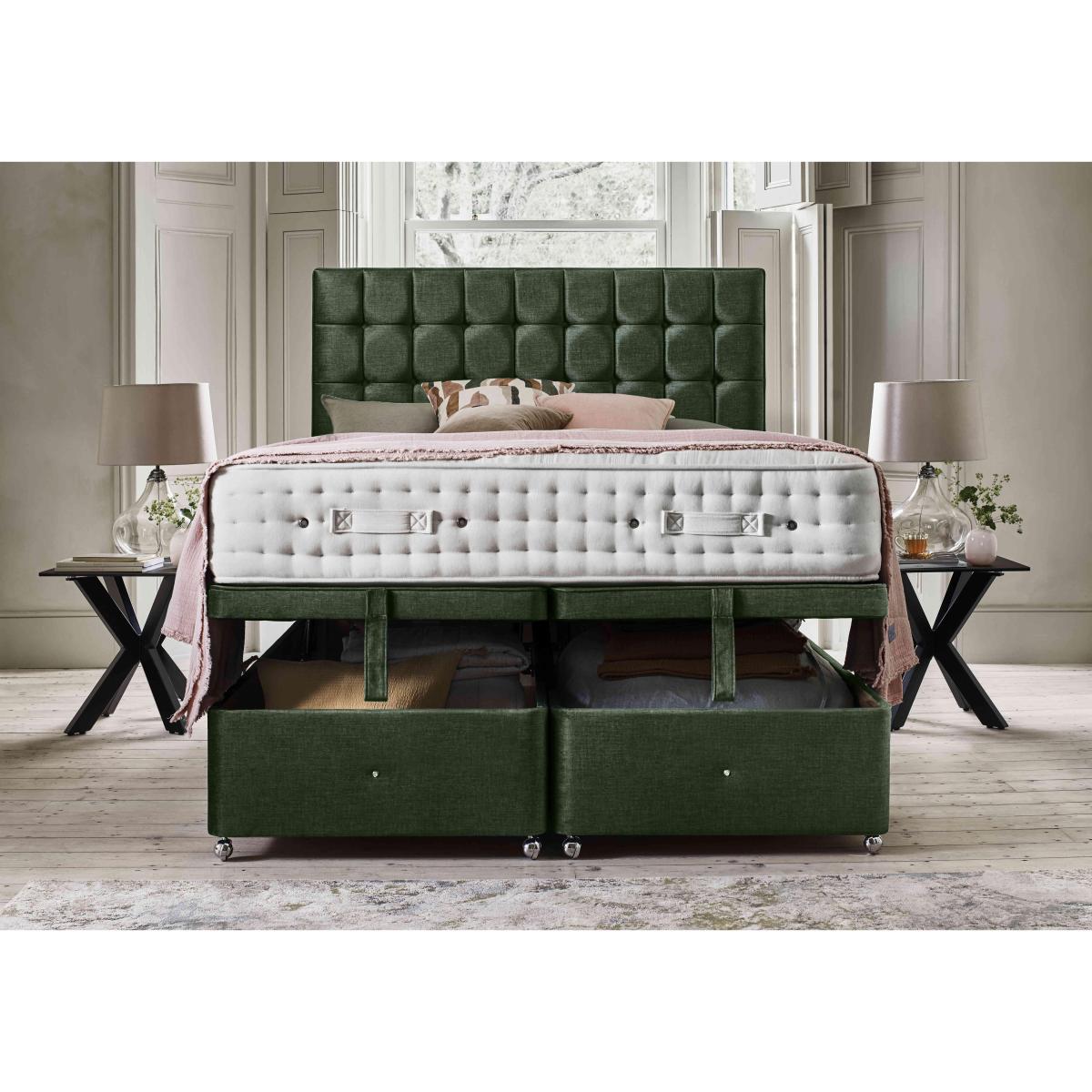 Luxury comfort and firm support come together beautifully in the Hypnos Luxury Firm collection. Alongside superior craftsmanship and exceptional quality, this collection gives firm-mattress seekers something else – outstanding choice. The collection comprises four ranges – Hypnos Luxury Firm 1, Hypnos Luxury Firm 2, Hypnos Luxury Firm 3 and Hypnos Luxury Firm 4 – each of which offers a different combination of firm or extra-firm support and sumptuous comfort with layers of ReActive™ 6-turn pocket springs, cooling British-certified wool, and all-natural fillings. Shop the complete Luxury Firm collection for mattresses and divan sets with ottoman storage, hideaway storage and optional drawers. Handcrafted in the UK exclusively for Furniture Village. With spacious underbed storage plus an extra firm yet very luxurious mattress, this Hypnos ottoman divan set is like no other. And you’ll only find it at Furniture Village. Why you'll love it Enjoy practical storage and an ultra-firm mattress in this stylish ottoman divan set. A unique combination of truly luxurious comfort and extra firm support. 1,600 ReActive™ 6-turn pocket springs in king size respond to your shape and weight. Layers of temperature-regulating wool, cotton, flax, hemp and comfort fibres. Chemical-free linen and cotton sleep surface. Traditionally crafted with tufting and 3 rows of side stitching. Set on a supportive platform top base with spacious ottoman storage. Wide choice of upholstery fabrics. Handmade in the UK by Hypnos exclusively for Furniture Village. This ottoman divan set is part of the Hypnos Luxury Firm 4 range. What you need to know Mattress type: Pocket spring. Depth: 30 cm. Firmness: Extra firm. Springs: 1,600 ReActive™ 6-turn pocket springs in king size. Pillow top: No. Fillings: British certified wool; responsibly sourced cotton, flax and hemp; e. Olus™ recycled comfort fibres. Cover: Cotton, flax. Requires turning: No. Base type: Platform top with ottoman storage. Sizes: Single, double, king, super king. Mattress care:Air for 4 hours before using to remove any odour. Allow at least 4 hours for springs to settle and for mattress to attain its full size. Indentations caused by settlement of fillings or body weight are normal and are not considered defects. If used on a slatted bed frame, the space between slats must be no wider than 7.5 cm. Spaces wider than this may cause excess dipping of the mattress and invalidate the guarantee. Always use a mattress protector. Rotate regularly. Divan base care: Clean upholstery weekly using a soft brush or vacuum with the curtain attachment. Professional cleaning advised for oil- and grease-based stains. Some fabrics can show wear on areas of more use or in direct sunlight.