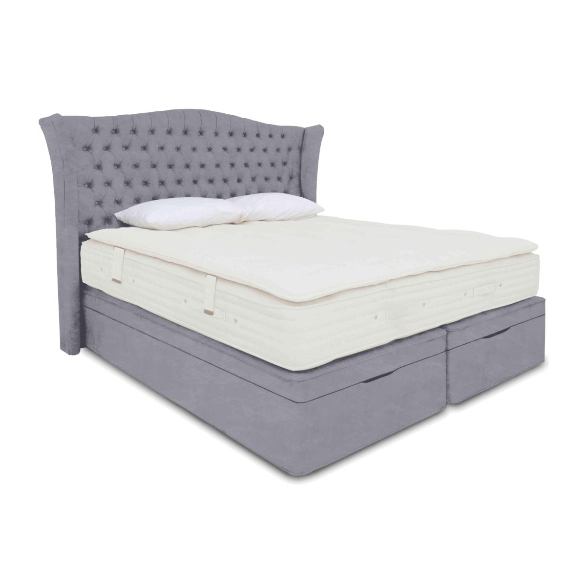 Enjoy royally comfortable sleep with the mattresses and divan beds in our Hypnos Bespoke Majestic collection. Mattresses are layered with 10-turn ReActivePro™ pocket springs, naturally luxurious Talalay latex, cotton, responsibly sourced British wool for cooling comfort and, perhaps best of all, sumptuous pillow tops. Pillow tops are detachable, which makes the mattresses in this collection turnable – we recommend seasonally – for comfort that lasts even longer. The collection also includes divan sets with optional storage drawers and ottoman compartments. The handcrafted Hypnos Bespoke Majestic range is exclusive to Furniture Village. Both the mattress and the ottoman storage divan base in this set are sprung for superb support. The mattress has latex, cotton and British wool fillings and a detachable pillow top for luxurious comfort. Why you'll love it Wonderful ottoman divan set has a sumptuous mattress with a detachable pillow top. Mattress has 1800 10-turn ReActivePro™ pocket springs in king size for responsive support. Layers of Talalay latex offer a naturally luxurious feel. Filled with cotton and traceable British wool that meets the Responsible Wool Standard. Removable pillow top is filled with wool and Talalay latex. Woven damask sleep surface made from responsibly sourced unbleached cotton. Triple Edge Protection™ and 4 rows of hand side stitching for superior edge support. Mattress requires only seasonal turning for year-round comfort and support. Choice of medium, firm and dual medium/firm tension. Sprung, firm-edge platform-top divan base has 1000 pocket springs in king size. With spacious end-opening ottoman storage compartment. In an exceptionally wide selection of upholstery fabrics. Handcrafted in England and only at Furniture Village. This sprung ottoman divan set is part of the Hypnos Bespoke Majestic range. What you need to know Headboard is available separately. Mattress type: Pocket spring. Depth: 33 cm. Weight:Single 31.1 kg, small double 41.1 kg, double 46.6 kg, king 54.5 kg and super king 65.4 kg. Firmness: Medium and firm. Dual tension available in king and super king sizes. Springs: 1800 in king size. Pillow top: Yes – filled with wool and Talalay latex. Fillings: Wool, Talalay latex and cotton. Cover: Cotton, viscose and flax. Requires turning: Yes. Base type: Sprung, firm-edge platform-top with end-opening ottoman storage. Sizes: Single, small double, double, king, super king. Mattress care:Air for 4 hours before using to remove any odour. Indentations caused by settlement of fillings or body weight are normal and are not considered defects. If used on a slatted bed frame, the space between slats must be no wider than 7.5 cm. Spaces wider than this may cause excess dipping of the mattress and invalidate the guarantee. Always use a mattress protector. Rotate regularly. Divan base care: Clean upholstery weekly using a soft brush or vacuum with the curtain attachment. Professional cleaning advised for oil- and grease-based stains. Some fabrics can show wear on areas of more use or in direct sunlight.