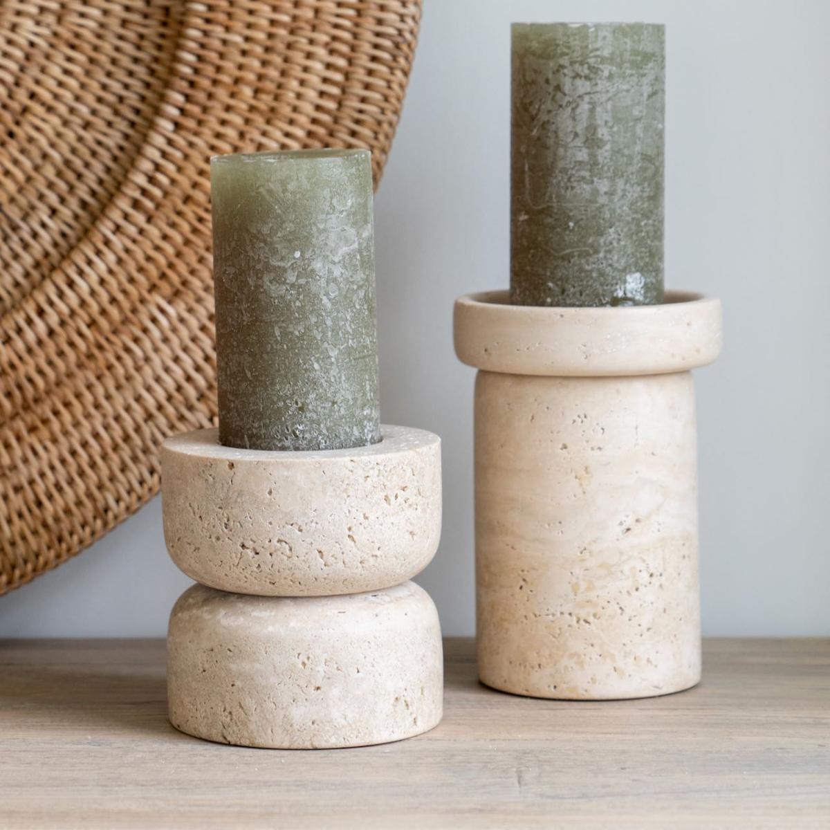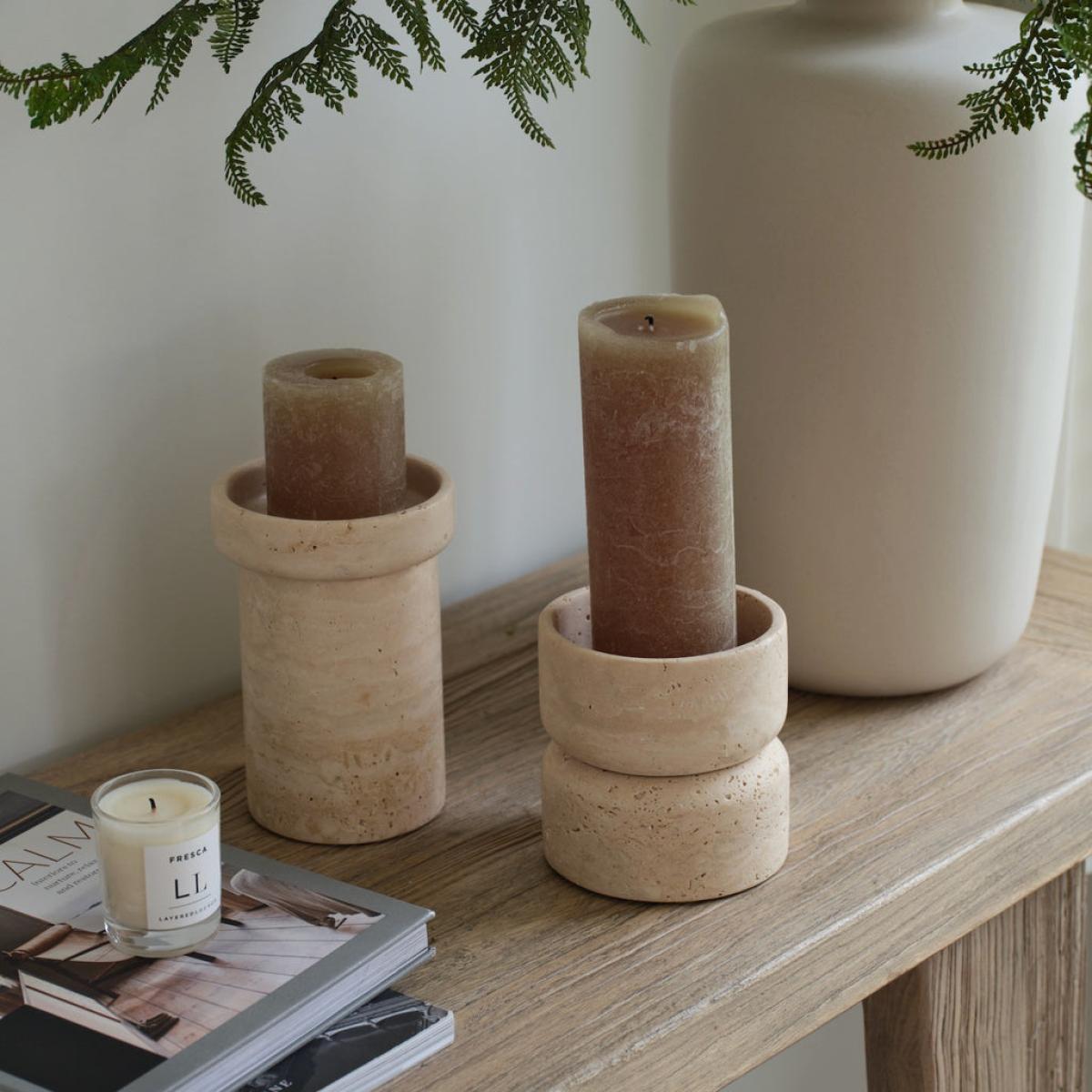 Looking for how to give your overall look that extra special high end touch, then these are the candle holders for you! Made from high quality travertine, these beautiful honed stone candlesticks are an interior designers dream. Available if two different heights and designs you can place either on there own or better still style together on your console for a beautifully textured and sculptural look. Substantial decor pieces for your home.