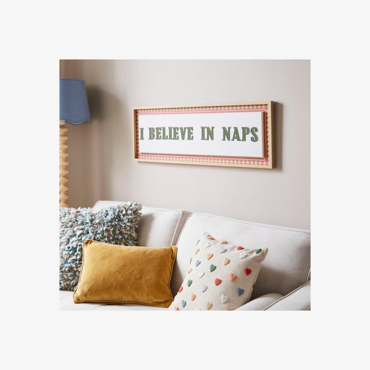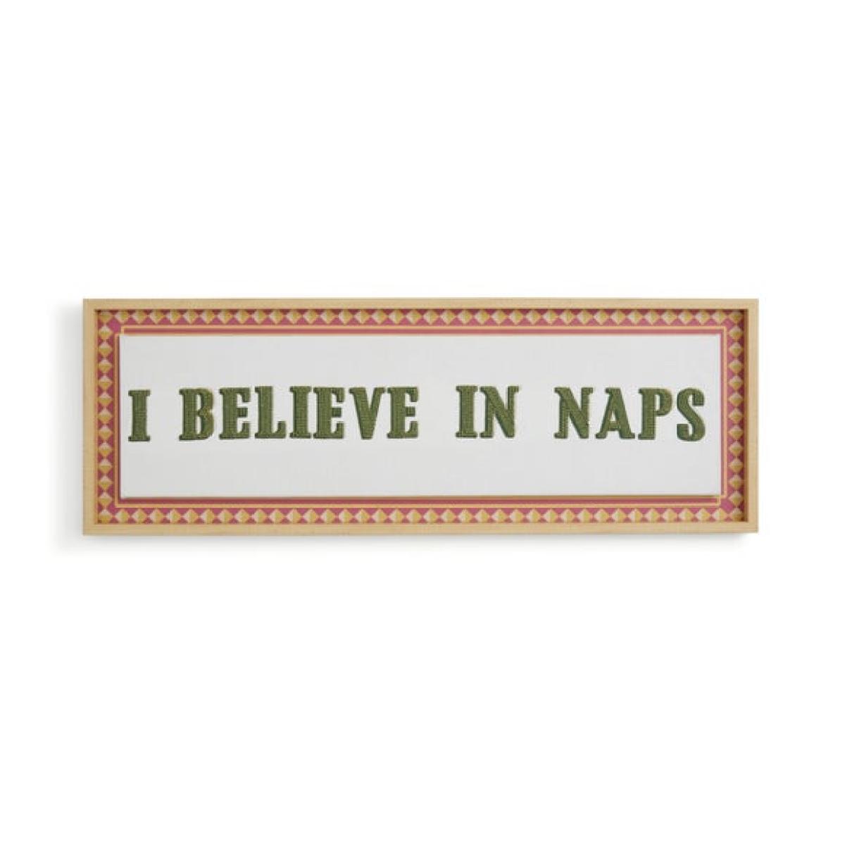 * Textured stitching * Natural wood effect frame * Green lettering * Colourful patterned border This embroidered framed canvas brings a playful touch to your space with its bold 'I Believe In Naps' slogan. Textured stitching adds depth, giving the piece a tactile, handmade feel. The green lettering stands out against the neutral background, while the colourful patterned border adds a fun pop of detail. Set in a natural wood-effect frame, it’s easy to style in bedrooms, cosy corners or relaxed living spaces, and is perfect for anyone who values rest and a bit of humour in their décor. A light-hearted piece that’s full of personality.