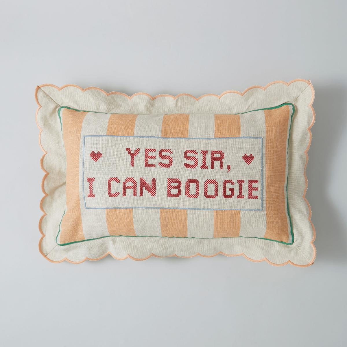 * Rectangle shape cushion* Whimsical stripe design with slogan* Frilled edge finish Add a little charm to your home décor with this delightful rectangular cushion. Sporting a vintage design with a modern slogan print, this cushion is perfect for lifting the mood in any space. Adorned with a delicate frilled edge allowing you to make a statement within your home easily.
