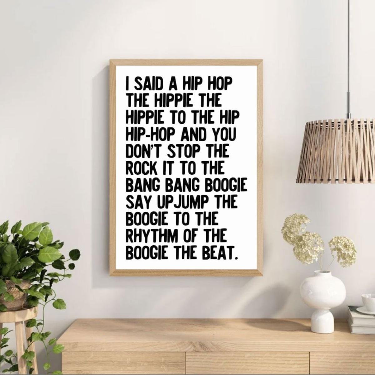 This hip hop print makes a bold statement, perfect for adding an urban edge to contemporary or eclectic interiors. I love how its black and white colour palette keeps it versatile, easily pairing with both minimalist spaces and more layered, vibrant environments. It works particularly well in living rooms, bedrooms, or home offices where a touch of musical attitude is desired. For styling, consider framing it with a sleek black or simple white frame to enhance its modern appeal, and hang it at eye level alongside other monochrome or graphic elements for a cohesive look. It can also be a focal point above a sofa or console, grounding the space with its strong typographic message.