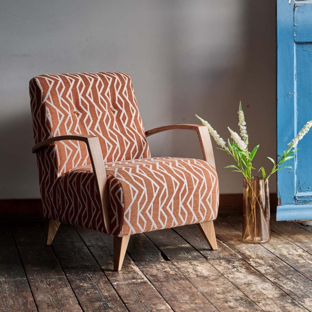 The Ibberton Chair is a luxurious accent to any living room or bedroom. Its patterned chenille upholstery combines with wooden arms and legs to create a stunning modern take on classic Scandinavian style, which is an ever-popular choice in interior design. The bold and vibrant tones of the marmalade-coloured fabric perfectly complement and contrast the cosy aesthetic created by the weathered ash accents, producing a stylish yet supremely comfortable accent chair.. Please note: Colour and grain pattern may vary on the wood as it is natural timber from sustainable sources.. *Dimensions: W73cm x D67cm x H85cm *Seat Height: 43cm *Seat Depth: 52cm *Seat Width: 59cm *Simple Self Assembly *Chenille Fabric *Weathered Ash Arms and Legs *Thick Seat Pad
