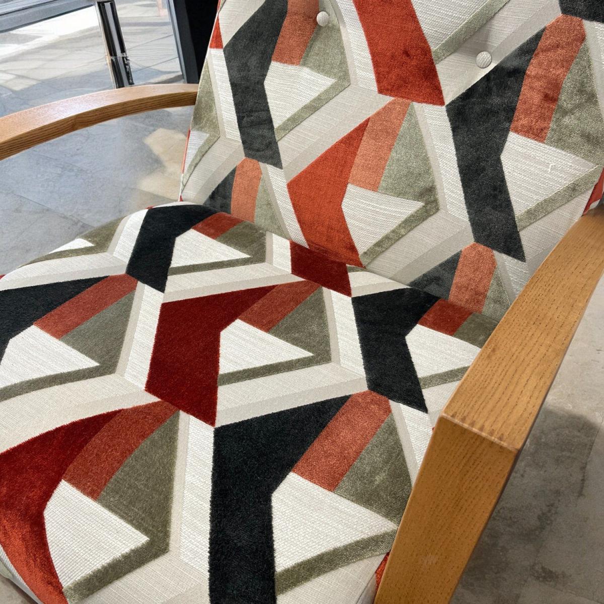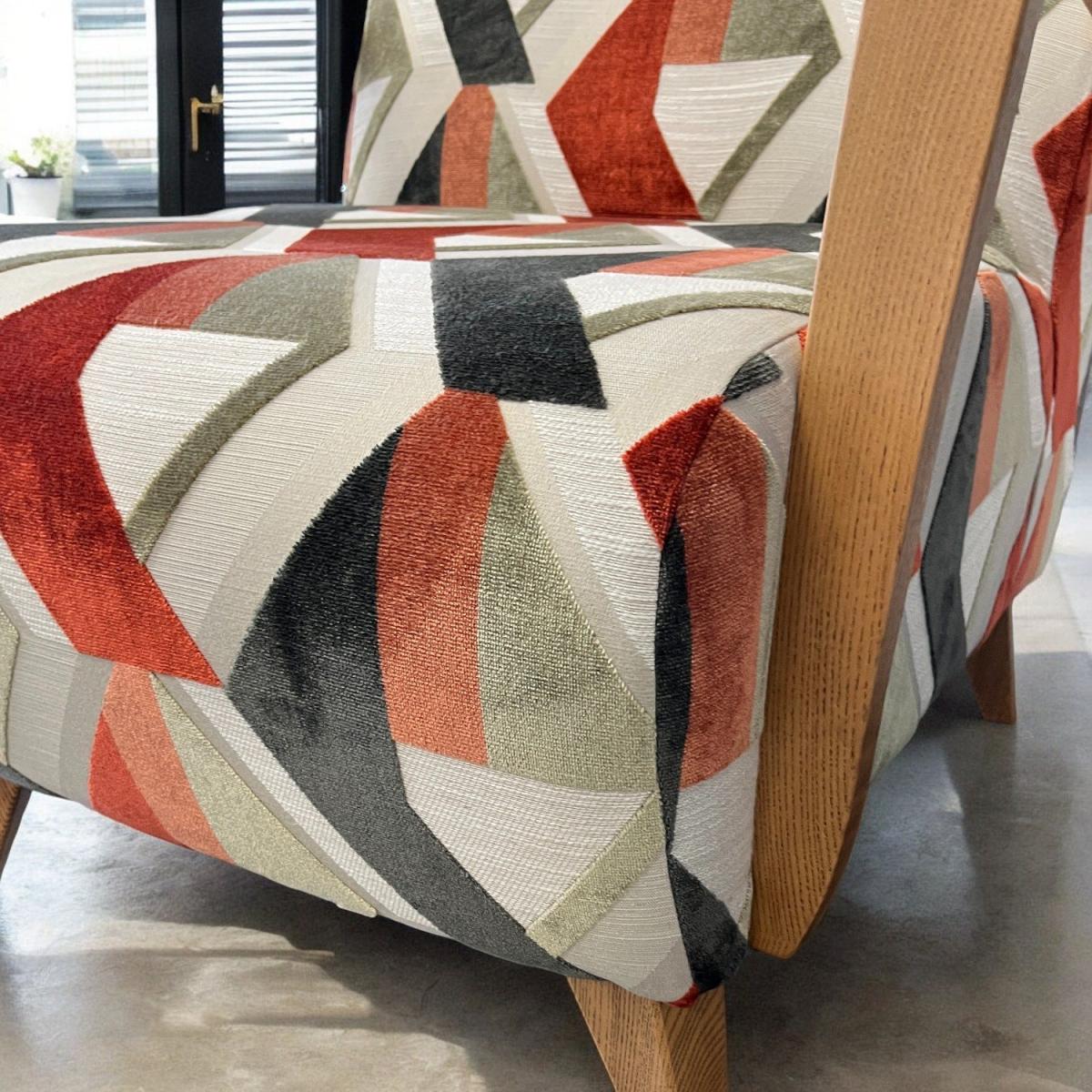The Ibberton Chair is a luxurious accent to any living room or bedroom. Its geometric patterned velvet upholstery design blends seamlessly with wooden arms and legs to create a striking yet modern take on timeless Scandinavian style. The bold and vibrant tones of the multicoloured fabric perfectly complement and contrast the cosy aesthetic created by the weathered ash accents, producing a stylish yet supremely comfortable accent chair.